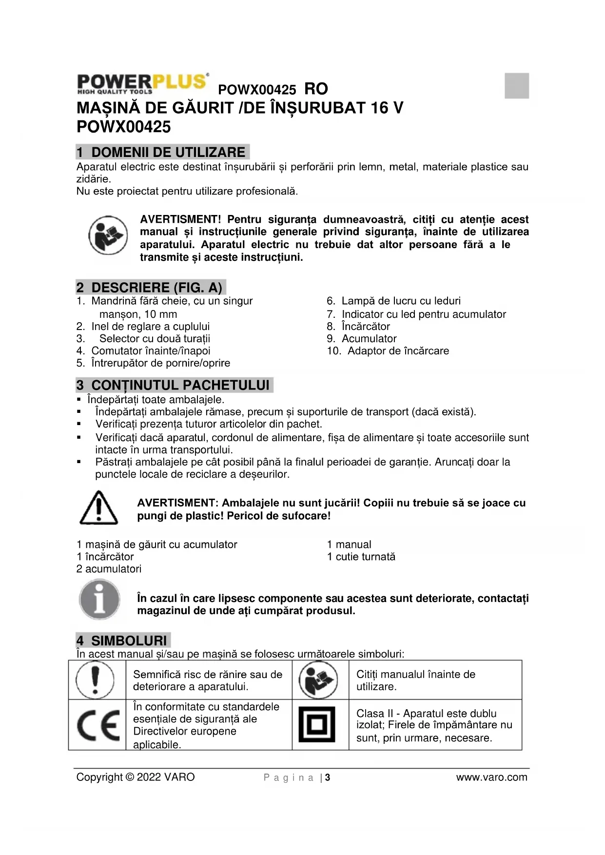 VARO N.V. - Vic. Van Rompuy N.V.- Joseph Van Instraat 9 - BE2500 Lier - BELGIA, declară că produsul: Mașină De Găurit /De Înșurubat marcă de comerț: POWERplus model: POWX00425 este în conformitate cu specificațiile esențiale și alte prevederi relevante ale Directivelor Europene aplicabile, pe baza aplicării standardelor europene armonizate. Orice modificare neautorizată a aparatelor atrage după sine anularea acestei declarații. Directivele europene (inclusiv, dacă este cazul, amendamentele lor, până la data semnăturii): 2014/30/EU 2006/42/EC 2011/65/EU Standardele europene armonizate (inclusiv, dacă este cazul, amendamentele lor, până la data semnăturii): EN62841-1 : 2015 EN62841-2-1 : 2018 EN55014-1 : 2017 EN55014-2 : 2015 Persoana care păstrează documentația tehnică: Philippe Vankerkhove, VARO – Vic. Van Rompuy N.V. Subsemnatul acționează în numele Directorului general executiv al societății, Ludo Mertens Divizia de reglementare – Director de conformitate 22/12/2021, Lier - BelgiumPOWX00425 PL Copyright © 2022 VARO S t r o n a | 1 www.varo.com 1 ZASTOSOWANIE ........................................................................... 3