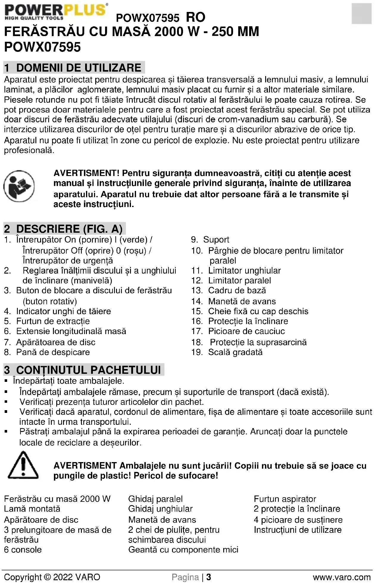 - Păstrați ambalajul până la expirarea perioadei de garanție. Aruncați doar la punctele locale de reciclare a deșeurilor. AVERTISMENT Ambalajele nu sunt jucării! Copiii nu trebuie să se joace cu pungile de plastic! Pericol de sufocare! Ferăstrău cu masă 2000 W Lamă montată Apărătoare de disc 3 prelungitoare de masă de ferăstrău 6 console Ghidaj paralel Ghidaj unghiular Manetă de avans 2 chei de piulițe, pentru schimbarea discului Geantă cu componente mici Furtun aspirator 2 protecție la înclinare 4 picioare de susținere Instrucțiuni de utilizarePOWX07595 RO Copyright © 2022 VARO Pagina | 4 www.varo.com În cazul în care lipsesc componente sau acestea sunt deteriorate, contactați magazinul de unde ați cumpărat produsul.