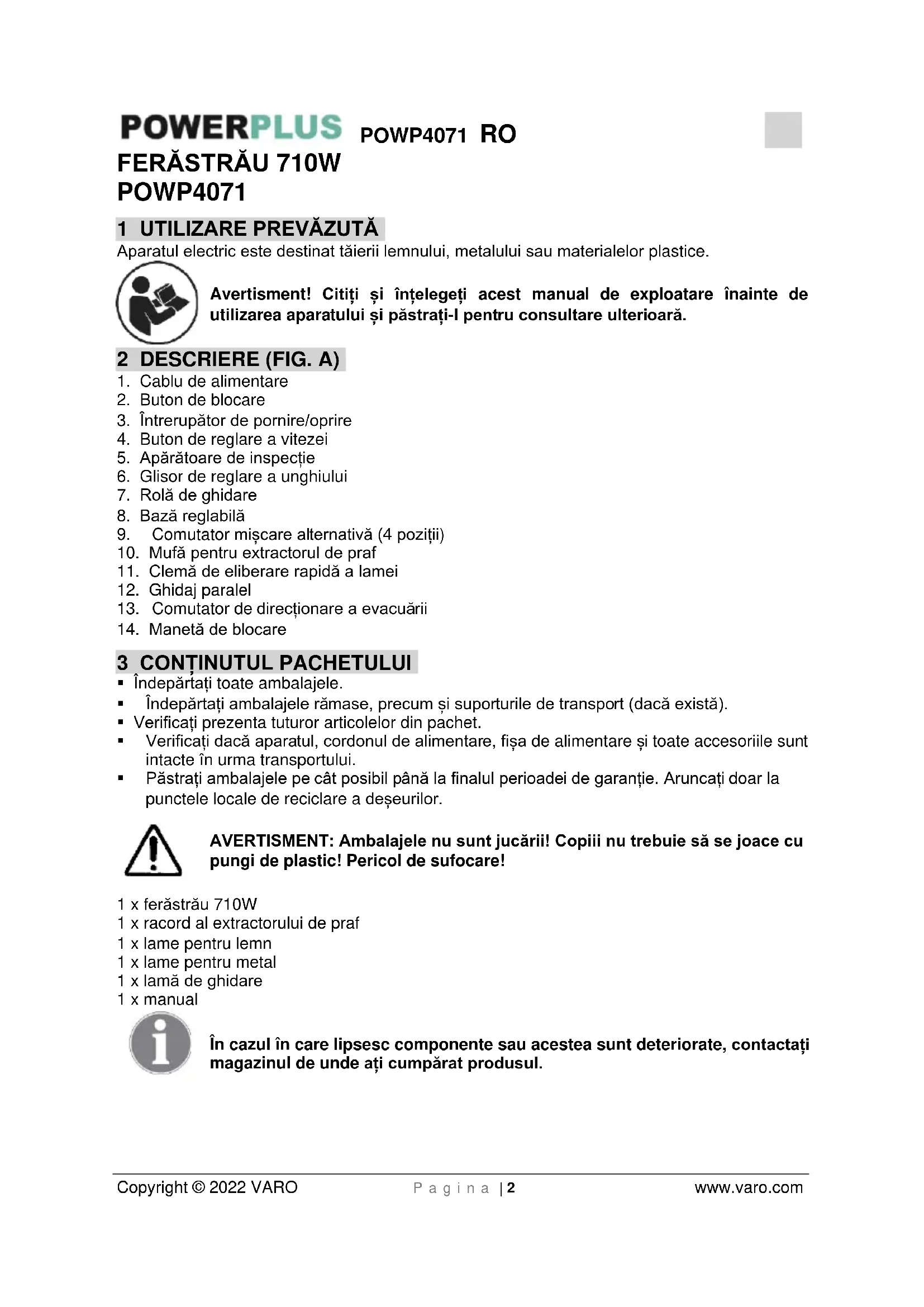 - Păstrați ambalajele pe cât posibil până la finalul perioadei de garanție. Aruncați doar la punctele locale de reciclare a deșeurilor. AVERTISMENT: Ambalajele nu sunt jucării! Copiii nu trebuie să se joace cu pungi de plastic! Pericol de sufocare! 1 x ferăstrău 710W 1 x racord al extractorului de praf 1 x lame pentru lemn 1 x lame pentru metal 1 x lamă de ghidare 1 x manual În cazul în care lipsesc componente sau acestea sunt deteriorate, contactați magazinul de unde ați cumpărat produsul.POWP4071 RO Copyright © 2022 VARO P a g i n a | 3 www.varo.com 4 SIMBOLURI În acest manual și / sau pe mașină se folosesc următoarele simboluri: