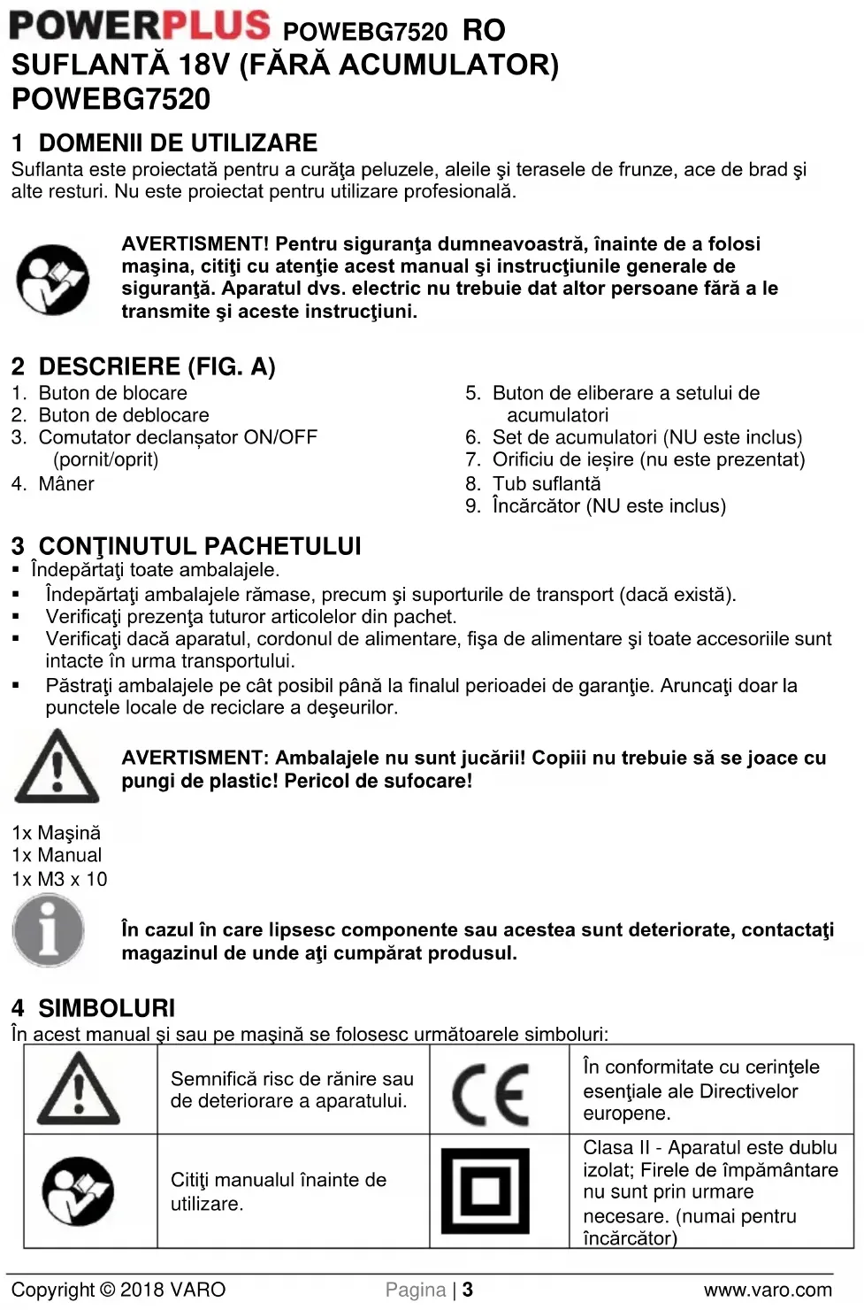 Clasa II - Aparatul este dublu izolat; Firele de împământare nu sunt prin urmare necesare. (numai pentru încărcător)POWEBG7520 RO Copyright © 2018 VARO Pagina | 4 www.varo.com