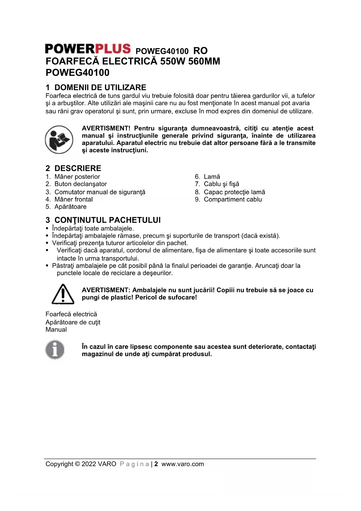 Avertisment! Înainte de a efectua orice lucrări la echipament, scoateţi din priză. Verificaţi cu regularitate maşina înainte de a începe lucrul. Lamele de tăiere deteriorate trebuie reparate sau înlocuite de un tehnician calificat, înainte de a lucra cu maşina. După fiecare tăiere, curăţaţi lama de tăiere cu o perie moale şi o cârpă cu ulei de lubrifiere şi pulverizaţi un strat subţire de ulei de protecţie pe întreaga lamă. Păstraţi întotdeauna curate fantele de aerisire din carcasa motoruluiPOWEG40100 RO Copyright © 2022 VARO P a g i n a | 7 www.varo.com Nu curăţaţi şi nu pulverizaţi niciodată maşina cu apă. Curăţaţi carcasa motorului doar cu o cârpă umedă şi nu aplicaţi niciodată detergenţi sau solvenţi! Aceştia pot distruge părţile din plastic ale maşinii. În încheiere, uscaţi cu grijă carcasa motorului. Depozitaţi maşina cu apărătoarea de cuţit montată. Utilizaţi numai accesorii şi piese de schimb originale.POWEG40100 RO Copyright © 2022 VARO P a g i n a | 8 www.varo.com 10 DATE TEHNICE Tip