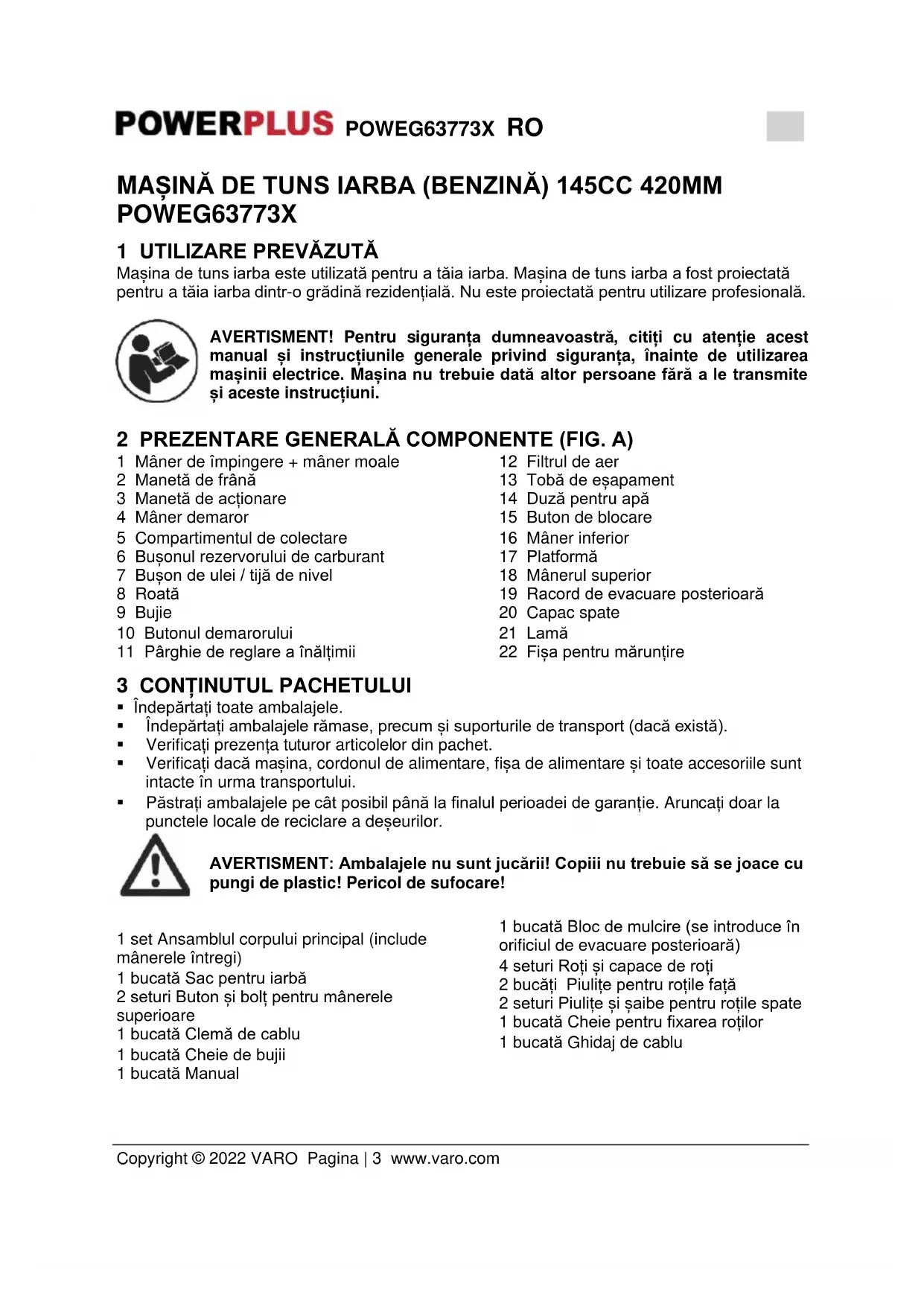 - adăugați carburant înainte de pornirea motorului. Nu scoateți bușonul rezervorului de carburant și nu adăugați benzină în timpul funcționării motorului sau atunci când motorul este cald.POWEG63773X RO Copyright © 2022 VARO Pagina | 7 www.varo.com