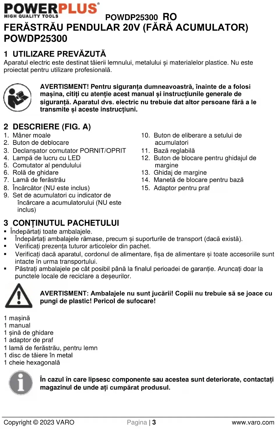 - Lama ferăstrăului va continua să se miște puțin timp după oprirea aparatului.POWDP25300 RO Copyright © 2023 VARO Pagina | 7 www.varo.com