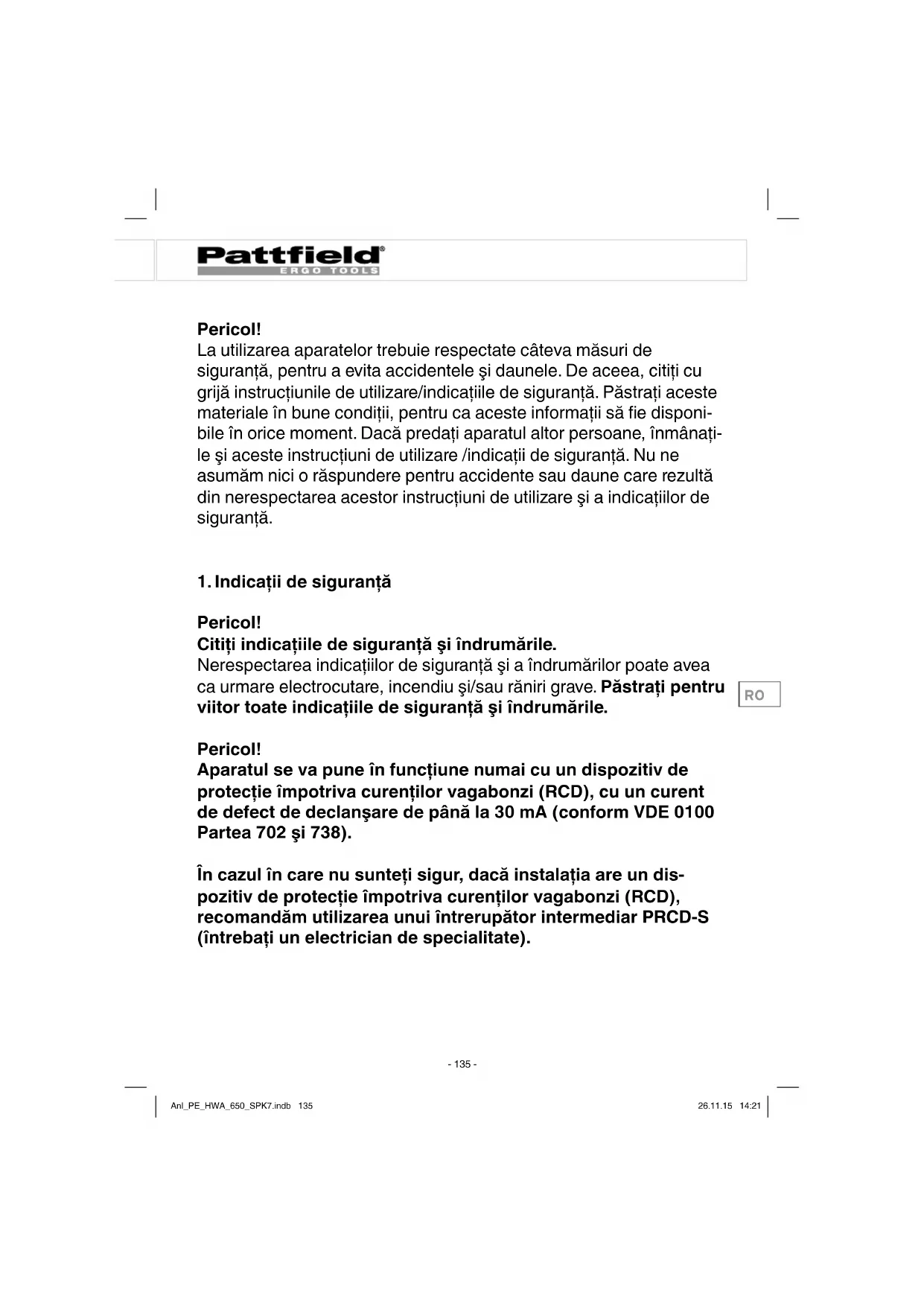 Pericol! Citiţi indicaţiile de siguranţă şi îndrumările. Nerespectarea indicaţiilor de siguranţă şi a îndrumărilor poate avea ca urmare electrocutare, incendiu şi/sau răniri grave. Păstraţi pentru viitor toate indicaţiile de siguranţă şi îndrumările. Pericol! Aparatul se va pune în funcţiune numai cu un dispozitiv de protecţie împotriva curenţilor vagabonzi (RCD), cu un curent de defect de declanşare de până la 30 mA (conform VDE 0100 Partea 702 şi 738). În cazul în care nu sunteţi sigur, dacă instalaţia are un dis- pozitiv de protecţie împotriva curenţilor vagabonzi (RCD), recomandăm utilizarea unui întrerupător intermediar PRCD-S (întrebaţi un electrician de specialitate). Anl_PE_HWA_650_SPK7.indb 135Anl_PE_HWA_650_SPK7.indb 135 26.11.15 14:2126.11.15 14:21RO
