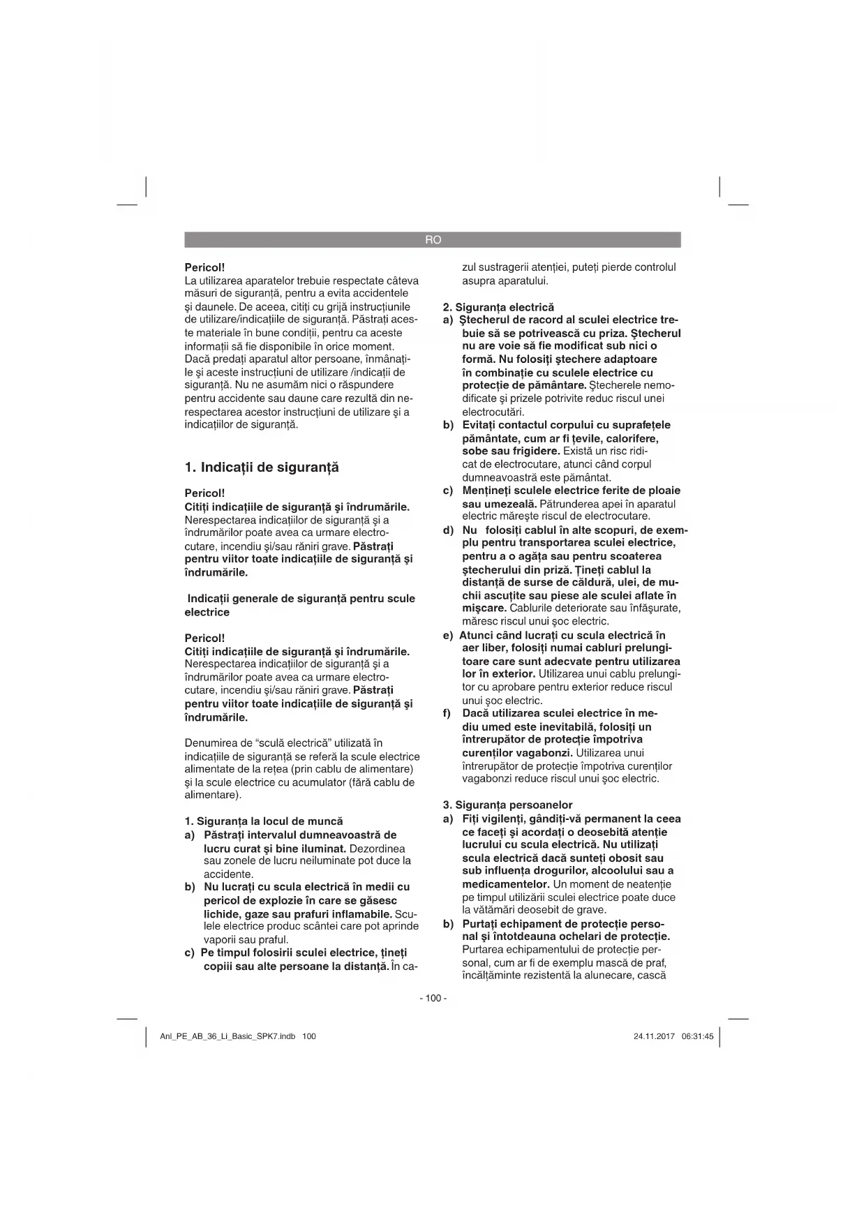 a) Fiţi vigilenţi, gândiţi-vă permanent la ceea ce faceţi şi acordaţi o deosebită atenţie lucrului cu scula electrică. Nu utilizaţi scula electrică dacă sunteţi obosit sau sub infl uenţa drogurilor, alcoolului sau a medicamentelor. Un moment de neatenţie pe timpul utilizării sculei electrice poate duce la vătămări deosebit de grave. b) Purtaţi echipament de protecţie perso- nal şi întotdeauna ochelari de protecţie. Purtarea echipamentului de protecţie per- sonal, cum ar fi de exemplu mască de praf, încălţăminte rezistentă la alunecare, cască Anl_PE_AB_36_Li_Basic_SPK7.indb 100Anl_PE_AB_36_Li_Basic_SPK7.indb 100 24.11.2017 06:31:4524.11.2017 06:31:45RO