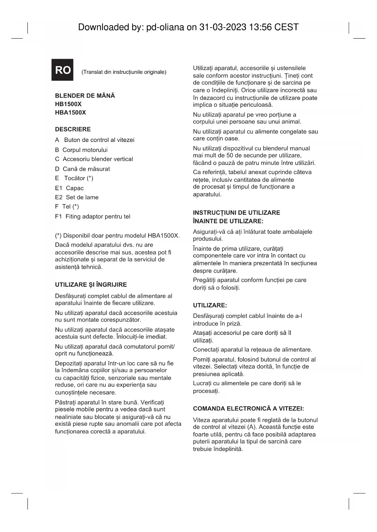 Desfășurați complet cablul de alimentare al aparatului înainte de ecare utilizare. Nu utilizați aparatul dacă accesoriile acestuia nu sunt montate corespunzător. Nu utilizați aparatul dacă accesoriile atașate acestuia sunt defecte. Înlocuiți-le imediat. Nu utilizați aparatul dacă comutatorul pornit/ oprit nu funcționează. Depozitați aparatul într-un loc care să nu e la îndemâna copiilor și/sau a persoanelor cu capacități zice, senzoriale sau mentale reduse, ori care nu au experiența sau cunoștințele necesare. Păstrați aparatul în stare bună. Vericați piesele mobile pentru a vedea dacă sunt nealiniate sau blocate și asigurați-vă că nu există piese rupte sau anomalii care pot afecta funcționarea corectă a aparatului. Downloaded by: pd-oliana on 31-03-2023 13:56 CESTDUPĂ CE AȚI TERMINAT DE UTILIZAT APARATUL: Opriți aparatul, ridicând degetul de pe buton. Scoateți aparatul din priză. Curățați aparatul. ACCESORII: ACCESORIU BLENDER DE MÂNĂ : Acest accesoriu este folosit pentru a prepara sosuri, maioneză, milkshake-uri, hrană pentru copii etc. Atașați blenderul de corpul motorului și rotiți în direcția indicată de săgeată. Puneți alimentele care urmează să e preparate în cană și porniți aparatul. Pentru curățarea ulterioară, detașați și scoateți blenderul manual rotind în direcția opusă săgeții. ACCESORIUL DE TOCAT: Acest accesoriu este folosit pentru tocarea legumelor sau a cărnii. Pentru a evita deteriorarea aparatului, îndepărtați oasele, nervii, cartilajul etc. din carne. Puneți setul de lame și alimentele care urmează să e preparate în vasul de tocat. Puneți capacul pe tocător, asigurându-vă că se xează în poziție. Atașați unitatea la capac și porniți aparatul (ți atent: nu porniți aparatul dacă întreaga unitate nu este montată corect și nu este bine îmbinată). Opriți aparatul, atunci când alimentele ajung la textura dorită. Detașați unitatea de pe capac și eliberați capacul. NOTA 1: nu depășiți jumătatea vasului mașinii de tocat dacă tocați alimente solide. NOTA 2: Dacă folosiți alimente lichide, nu depășiți 300 ml. IMPORTANT: eliberați capacul numai când lamele se opresc complet. ACCESORIUL TEL: Acest accesoriu este folosit pentru baterea friștii, a albușurilor de ou etc. Inserați telul în adaptor. Atașați unitatea la corpul motorului. Puneți alimentele într-un recipient mare și porniți aparatul. Pentru rezultate optime, deplasați telul în sens orar. Scoateți accesoriul tel și eliberați tingul adaptor. Nota 1: Nu lucrați la viteze mari când este atașat acest accesoriu, întrucât aceasta va produce defecte ale telului (împletindu-i sârmele). CURĂȚARE Deconectați aparatul de la rețeaua de alimentare electrică și lăsați-l să se răcească înainte de efectuarea oricărei operații de curățare. Curățați aparatul cu o cârpă umedă și câteva picături de detergent lichid, apoi ștergeți-l. Nu utilizați solvenți sau produse cu pH acid sau bazic, precum înălbitori sau produse abrazive, pentru curățarea aparatului. Nu scufundați niciodată aparatul în apă sau în orice alt lichid și nu lăsați apa să curgă pe acesta. În timpul procesului de curățare ți foarte atenți la lame, deoarece sunt foarte ascuțite. Este recomandabil să curățați aparatul în mod regulat și să îndepărtați resturile de alimente. Dacă aparatul nu este bine curățat, suprafața acestuia se poate deteriora, afectând în mod inevitabil durata de funcționare, devenind nesigur pentru utilizare. Următoarele piese pot spălate în mașina de spălat vase (utilizând un program de curățare delicată): - Cană de măsurat - Mașină de tocat. - Tel. Poziția de scurgere/uscare a articolelor care pot plasate în mașina de spălat vase sau a celor puse în chiuvetă trebuie să faciliteze scurgerea. Apoi uscați toate piesele înainte de asamblare și depozitare. Downloaded by: pd-oliana on 31-03-2023 13:56 CESTIngredient Accesoriu recomandat recomendado Cantitate recomandată Timp Mâncare pentru bebeluși Blender manual 100-400 ml 50 s Fructe Blender manual 100-200 ml 50 s Legume Blender manual 100-200 ml 50 s Sosuri Blender manual 100-700 ml 50 s Aluaturi Blender manual 100-500 ml 50 s Ierburi Mașină de tocat 20 g 10-30 s Carne Mașină de tocat 450 g 4 s Nuci Mașină de tocat 200 g 30 s Brânză Mașină de tocat 150 g 30 s Pâine Mașină de tocat 1 felie 20 s Ouă erte tari Mașină de tocat 2 ouă 5 s Ceapă Mașină de tocat 100 g 10 s Downloaded by: pd-oliana on 31-03-2023 13:56 CESTPL (Przetłumaczone z oryginalnej instrukcji) MIKSER HB1500X HBA1500X OPIS A Przycisk regulacji prędkości B Korpus Silnika C Trzepaczka D Pojemnik dozujący E Rozdrabniacz (*) E1 Pokrywa E2 Zestaw ostrzy F Blender (*) F1 Reduktor akcesoriów do ubijania (*) Dostępne tylko w przypadku modelu HBA1500X. W przypadku, jeśli model Państwa urządzenia nie posiada opisanych powyżej akcesoriów, te można również nabyć osobno w Serwisie Technicznym.
