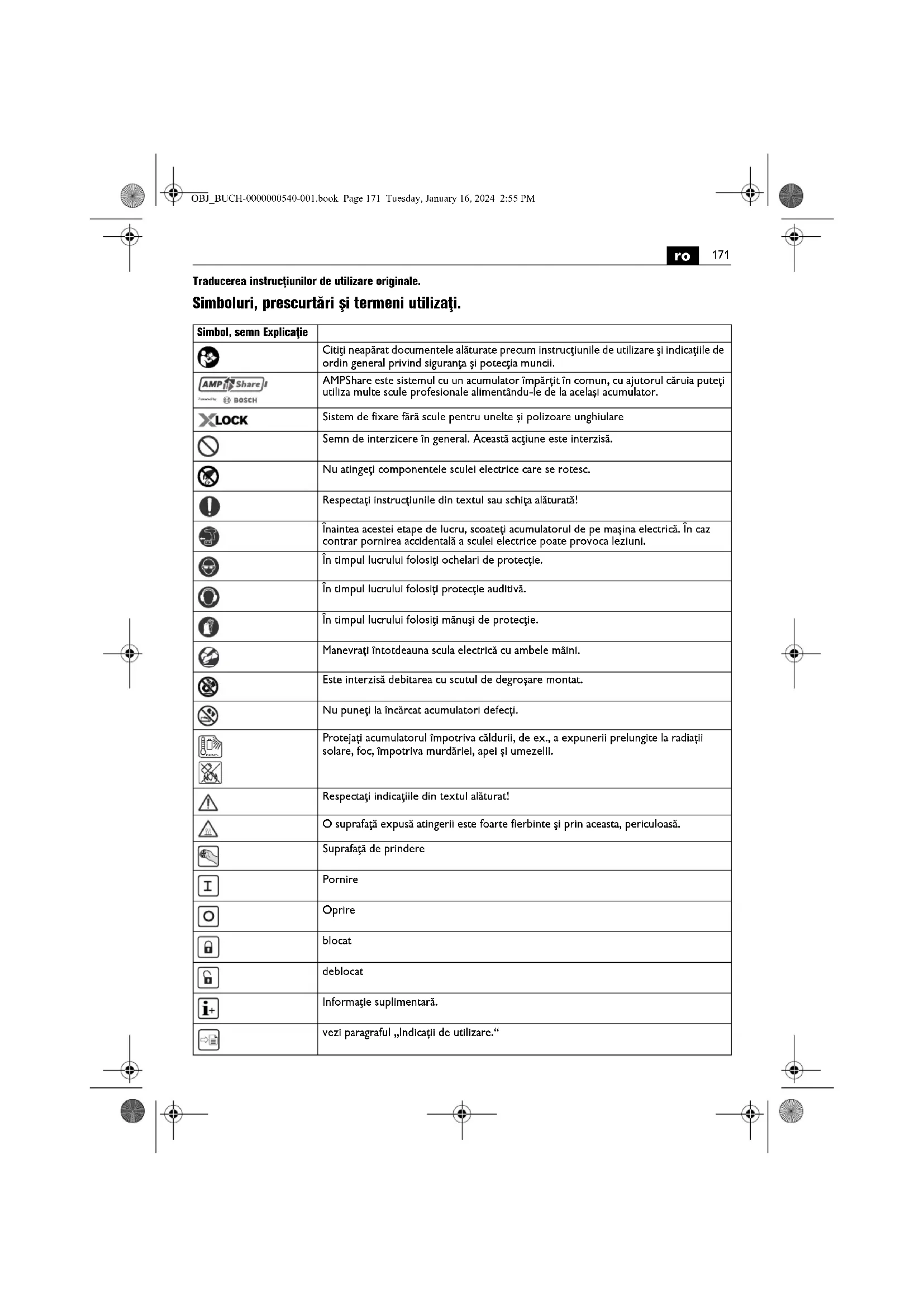 Traducerea instrucțiunilor de utilizare originale. Simboluri, prescurtări şi termeni utilizaţi. Simbol, semn Explicaţie Citiţi neapărat documentele alăturate precum instrucţiunile de utilizare şi indicaţiile de ordin general privind siguranţa şi potecţia muncii. AMPShare este sistemul cu un acumulator împărțit în comun, cu ajutorul căruia puteți utiliza multe scule profesionale alimentându-le de la același acumulator. Sistem de fixare fără scule pentru unelte și polizoare unghiulare Semn de interzicere în general. Această acţiune este interzisă. Nu atingeţi componentele sculei electrice care se rotesc. Respectaţi instrucţiunile din textul sau schiţa alăturată! Înaintea acestei etape de lucru, scoateţi acumulatorul de pe maşina electrică. În caz contrar pornirea accidentală a sculei electrice poate provoca leziuni. În timpul lucrului folosiţi ochelari de protecţie. În timpul lucrului folosiţi protecţie auditivă. În timpul lucrului folosiţi mănuşi de protecţie. Manevrați întotdeauna scula electrică cu ambele mâini. Este interzisă debitarea cu scutul de degroșare montat. Nu puneţi la încărcat acumulatori defecţi. Protejați acumulatorul împotriva căldurii, de ex., a expunerii prelungite la radiații solare, foc, împotriva murdăriei, apei și umezelii. Respectaţi indicaţiile din textul alăturat! O suprafaţă expusă atingerii este foarte fierbinte şi prin aceasta, periculoasă. Suprafaţă de prindere Pornire Oprire blocat deblocat Informaţie suplimentară. vezi paragraful „Indicații de utilizare.“ max.50°C OBJ_BUCH-0000000540-001.book Page 171 Tuesday, January 16, 2024 2:55 PM172