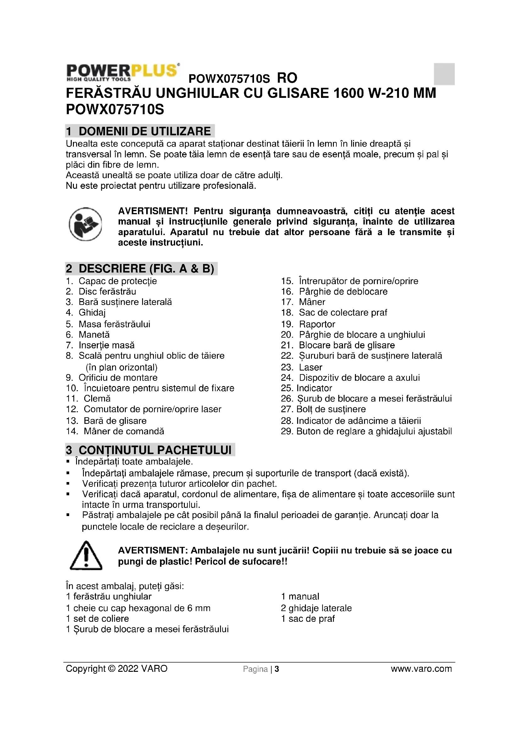 - Așteptați oprirea completă a discului ferăstrăului (2) înainte de a scoate piesa de prelucrat.POWX075710S RO Copyright © 2022 VARO Pagina | 10 www.varo.com