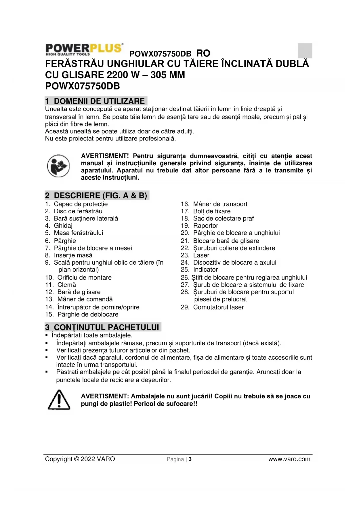 - Păstrați ambalajele pe cât posibil până la finalul perioadei de garanție. Aruncați doar la punctele locale de reciclare a deșeurilor. AVERTISMENT: Ambalajele nu sunt jucării! Copiii nu trebuie să se joace cu pungi de plastic! Pericol de sufocare!!POWX075750DB RO Copyright © 2022 VARO Pagina | 4 www.varo.com În acest ambalaj, puteți găsi: 1 ferăstrău unghiular Cheie cu cap hexagonal de 4 + 6 mm 1 clemă 1 manual 2 bară susținere laterală 1 sac de praf 2 ghidaj 1 mâner de transport În cazul în care lipsesc componente sau acestea sunt deteriorate, contactați magazinul de unde ați cumpărat produsul. 4 SIMBOLURI În acest manual și / sau pe mașină se folosesc următoarele simboluri: