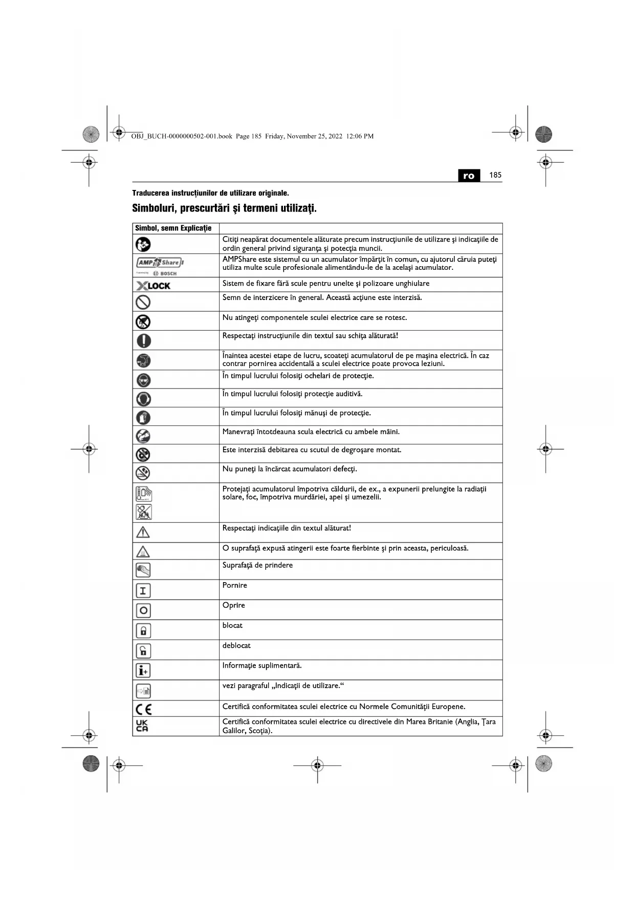 Traducerea instrucțiunilor de utilizare originale. Simboluri, prescurtări şi termeni utilizaţi. Simbol, semn Explicaţie Citiţi neapărat documentele alăturate precum instrucţiunile de utilizare şi indicaţiile de ordin general privind siguranţa şi potecţia muncii. AMPShare este sistemul cu un acumulator împărțit în comun, cu ajutorul căruia puteți utiliza multe scule profesionale alimentându-le de la același acumulator. Sistem de fixare fără scule pentru unelte și polizoare unghiulare Semn de interzicere în general. Această acţiune este interzisă. Nu atingeţi componentele sculei electrice care se rotesc. Respectaţi instrucţiunile din textul sau schiţa alăturată! Înaintea acestei etape de lucru, scoateţi acumulatorul de pe maşina electrică. În caz contrar pornirea accidentală a sculei electrice poate provoca leziuni. În timpul lucrului folosiţi ochelari de protecţie. În timpul lucrului folosiţi protecţie auditivă. În timpul lucrului folosiţi mănuşi de protecţie. Manevrați întotdeauna scula electrică cu ambele mâini. Este interzisă debitarea cu scutul de degroșare montat. Nu puneţi la încărcat acumulatori defecţi. Protejați acumulatorul împotriva căldurii, de ex., a expunerii prelungite la radiații solare, foc, împotriva murdăriei, apei și umezelii. Respectaţi indicaţiile din textul alăturat! O suprafaţă expusă atingerii este foarte fierbinte şi prin aceasta, periculoasă. Suprafaţă de prindere Pornire Oprire blocat deblocat Informaţie suplimentară. vezi paragraful „Indicații de utilizare.“ Certifică conformitatea sculei electrice cu Normele Comunităţii Europene. Certifică conformitatea sculei electrice cu directivele din Marea Britanie (Anglia, Țara Galilor, Scoția). max.50°C OBJ_BUCH-0000000502-001.book Page 185 Friday, November 25, 2022 12:06 PM186