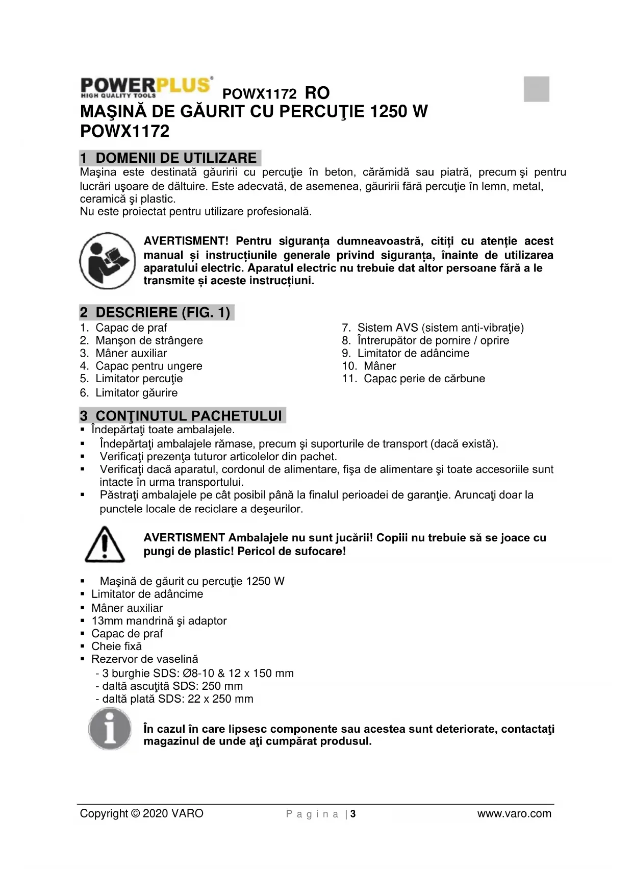 VARO N.V. - Joseph Van Instraat 9 - BE2500 Lier - BELGIA, declară că Produsul: Maşină de găurit cu percuţie Marcă de comerţ: POWERplus Model: POWX1172 este în conformitate cu specificaţiile esenţiale şi alte prevederi relevante ale Directivelor Europene aplicabile, pe baza aplicării standardelor europene armonizate. Orice modificare neautorizată a aparatelor atrage după sine anularea acestei declaraţii. Directivele europene (inclusiv, dacă este cazul, amendamentele lor, până la data semnăturii): 2011/65/EU 2006/42/EC 2014/30/EU Standardele europene armonizate (inclusiv, dacă este cazul, amendamentele lor, până la data semnăturii): EN60745-1 : 2009 EN60745-2-6 : 2010 EN55014-1 : 2017 EN55014-2 : 2015 EN61000-3-2 : 2014 EN61000-3-11 : 2000 Persoana care păstrează documentaţia tehnică: Philippe Vankerkhove, VARO – Vic. Van Rompuy N.V. Subsemnatul acţionează în numele Directorului general executiv al societăţii, Philippe Vankerkhove Divizia de reglementare – Director de conformitate Lier, 31/03/2020POWX1172 PL Copyright © 2020 VARO NV S t r o n a | 1 www.varo.com 1 ZASTOSOWANIE .............................................................................. 3 2 OPIS (RYC. 1) .................................................................................... 3