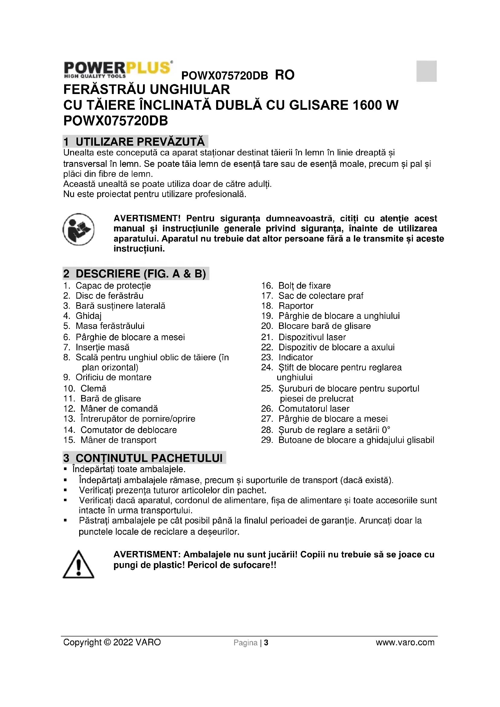 - Păstrați ambalajele pe cât posibil până la finalul perioadei de garanție. Aruncați doar la punctele locale de reciclare a deșeurilor. AVERTISMENT: Ambalajele nu sunt jucării! Copiii nu trebuie să se joace cu pungi de plastic! Pericol de sufocare!!POWX075720DB RO Copyright © 2022 VARO Pagina | 4 www.varo.com În acest ambalaj, puteți găsi: 1 ferăstrău unghiular 1 cheie Allen 1 clemă 1 manual 2 ghidaje laterale 1 sac de praf În cazul în care lipsesc componente sau acestea sunt deteriorate, contactați magazinul de unde ați cumpărat produsul. 4 SIMBOLURI În acest manual și / sau pe mașină se folosesc următoarele simboluri: