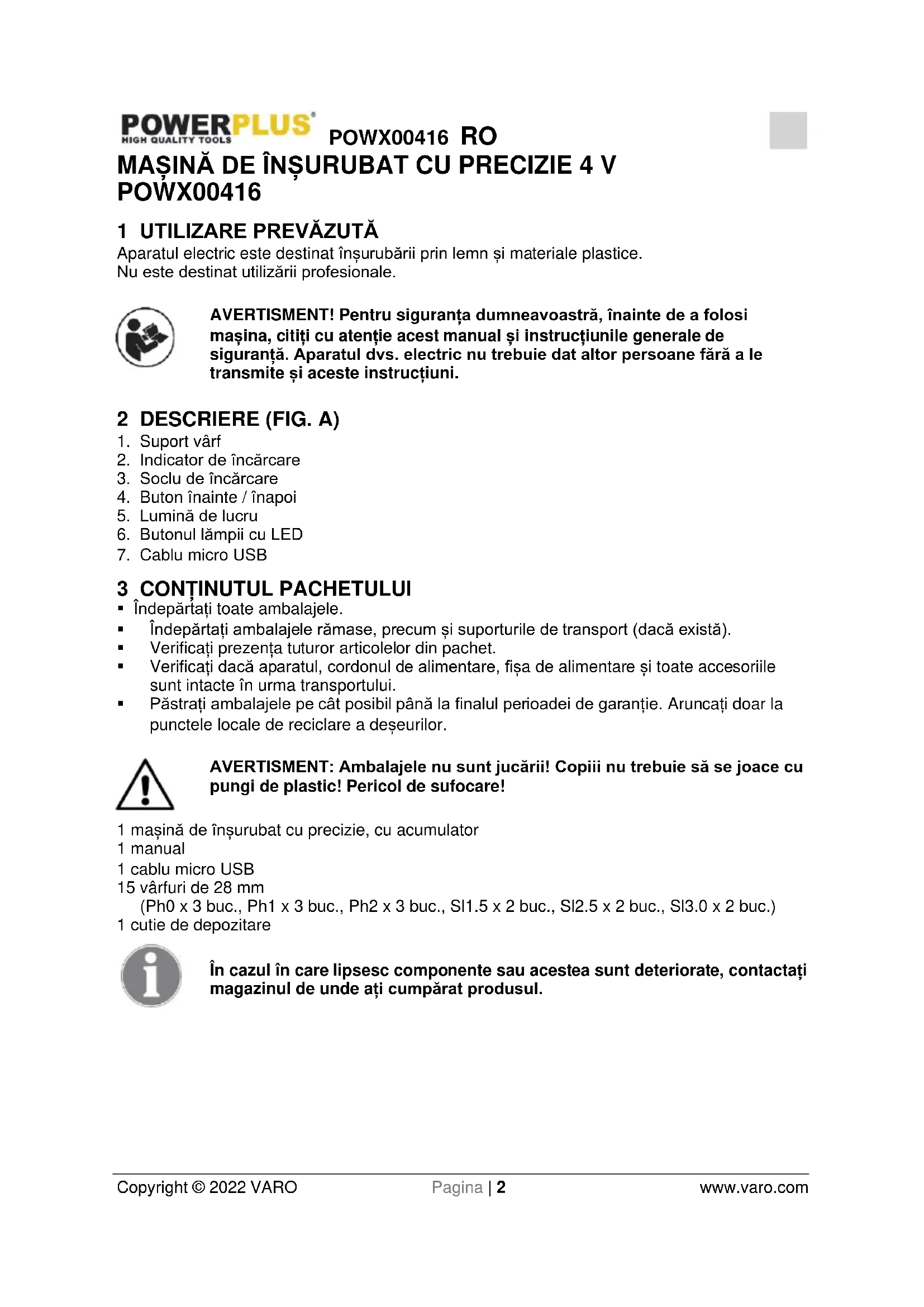 - Îndepărtați șuruburile blocate și înțepenite schimbând direcția de rotație.POWX00416 RO Copyright © 2022 VARO Pagina | 7 www.varo.com