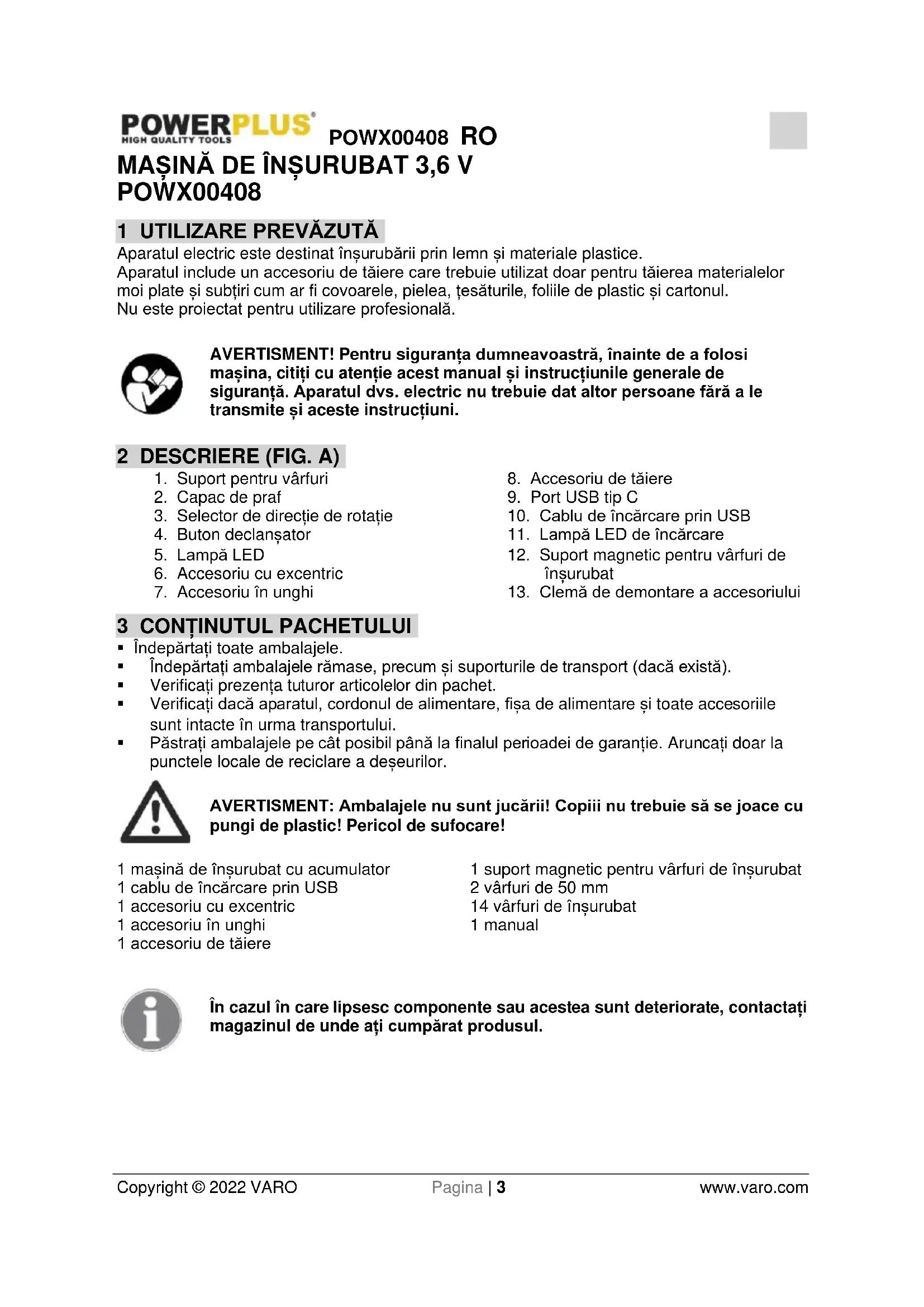 Persoana care păstrează documentația tehnică: Philippe Vankerkhove, VARO – Vic. Van Rompuy N.V. Subsemnatul acționează în numele Directorului general executiv al societății, Philippe Vankerkhove, MSc.EE. Divizia de reglementare – Director de conformitate 11/03/2022, Lier - BelgiumPOWX00408 PL Copyright © 2022 VARO Strona | 1 www.varo.com 1 PRZEZNACZENIE ........................................................................... 3