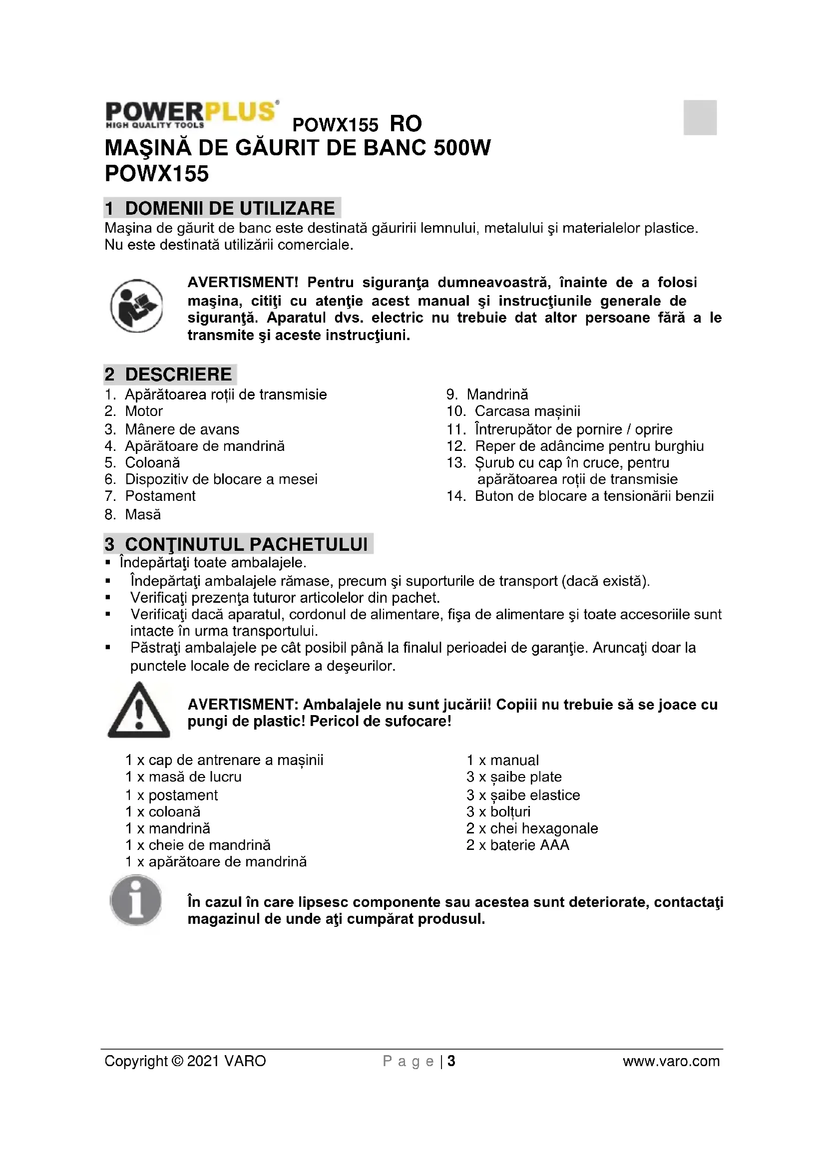 - Opriți alimentarea, scoateți burghiul și curățați masa după terminarea lucrului.POWX155 RO Copyright © 2021 VARO P a g e | 7 www.varo.com