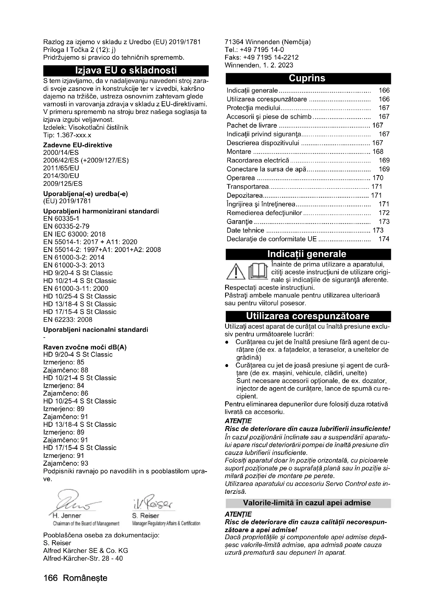 - Raven zvočne moči dB(A) HD 9/20-4 S St Classic Izmerjeno: 85 Zajamčeno: 88 HD 10/21-4 S St Classic Izmerjeno: 84 Zajamčeno: 86 HD 10/25-4 S St Classic Izmerjeno: 89 Zajamčeno: 91 HD 13/18-4 S St Classic Izmerjeno: 89 Zajamčeno: 91 HD 17/15-4 S St Classic Izmerjeno: 91 Zajamčeno: 93 Podpisniki ravnajo po navodilih in s pooblastilom upra- ve. Pooblaščena oseba za dokumentacijo: S. Reiser Alfred Kärcher SE & Co. KG Alfred-Kärcher-Str. 28 - 40 71364 Winnenden (Nemčija) Tel.: +49 7195 14-0 Faks: +49 7195 14-2212 Winnenden, 1. 2. 2023 Cuprins Indicații generale Înainte de prima utilizare a aparatului, citiţi aceste instrucţiuni de utilizare origi- nale şi indicaţiile de siguranţă aferente. Respectați aceste instrucțiuni. Păstraţi ambele manuale pentru utilizarea ulterioară sau pentru viitorul posesor. Utilizarea corespunzătoare Utilizaţi acest aparat de curăţat cu înaltă presiune exclu- siv pentru următoarele lucrări: ● Curățarea cu jet de înaltă presiune fără agent de cu- rățare (de ex. a fațadelor, a teraselor, a uneltelor de grădină) ● Curățarea cu jet de joasă presiune și agent de cură- țare (de ex. mașini, vehicule, clădiri, unelte) Sunt necesare accesorii opționale, de ex. dozator, injector de agent de curățare, lance de spumă cu re- cipient. Pentru eliminarea depunerilor dure folosiți duza rotativă livrată ca accesoriu. ATENŢIE Risc de deteriorare din cauza lubrifierii insuficiente! În cazul poziționării înclinate sau a suspendării aparatu- lui apare riscul deteriorării pompei de înaltă presiune din cauza lubrifierii insuficiente. Folosiți aparatul doar în poziție orizontală, cu picioarele suport poziționate pe o suprafață plană sau în poziție si- milară poziției de montare pe perete. Utilizarea aparatului cu accesoriu Servo Control este in- terzisă. Valorile-limită în cazul apei admise ATENŢIE Risc de deteriorare din cauza calității necorespun- zătoare a apei admise! Dacă proprietățile și componentele apei admise depă- șesc valorile-limită admise, apa admisă poate cauza uzură prematură sau depuneri în aparat. Indicații generale p. 166
