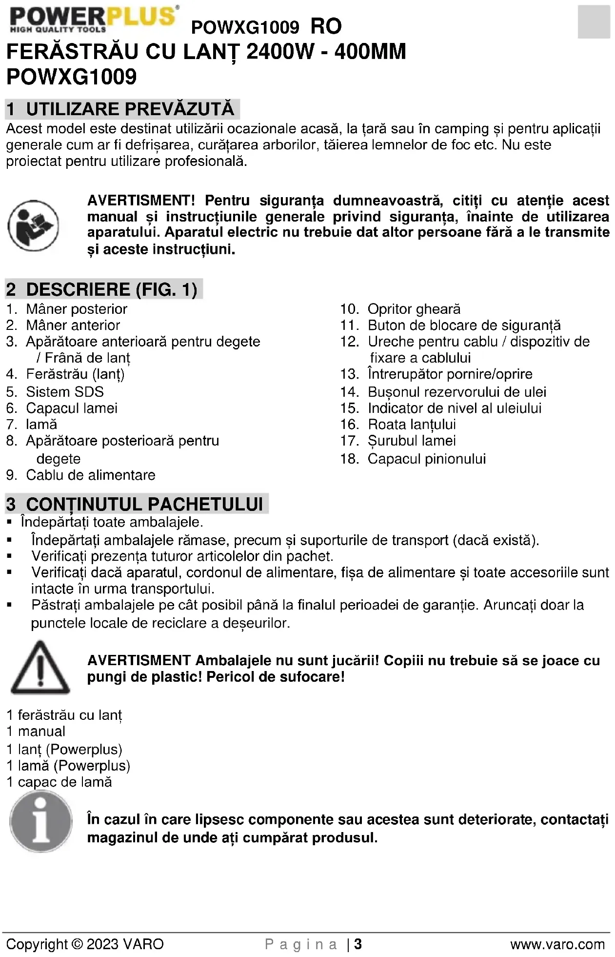 - Pe durata pauzelor, ferăstrăul trebuie pus jos, astfel încât să se elimine orice risc de rănire a oricărei persoane.POWXG1009 RO Copyright © 2023 VARO P a g i n a | 7 www.varo.com