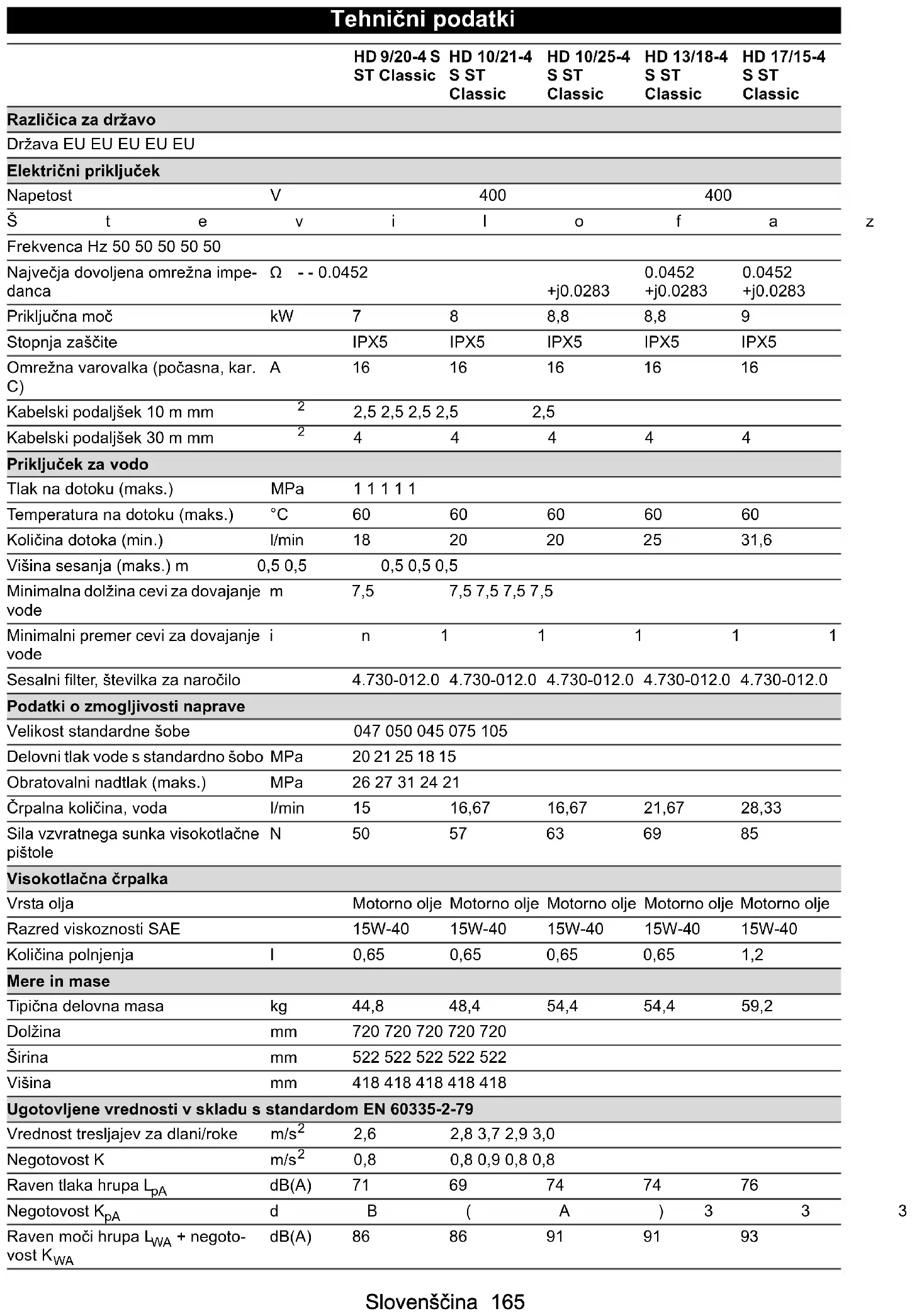tenţă clienţi autorizat. Garanţie În fiecare țară sunt valabile condițiile de garanție acor- date de distribuitorul nostru din țara respectivă. Eventu- ale defecțiuni survenite la aparat în perioada de garanție vor fi remediate gratuit, în limita în care sunt defecțiuni de fabricație sau de material. Pentru a bene- ficia de garanție, prezentați-vă cu chitanța de cumpăra- re la comerciantul dvs. sau la cea mai apropiată unitate de service autorizată. (Pentru adresă, consultați pagina din spate) Date tehnice HD 9/20-4 S ST Classic HD 10/21-4 S ST Classic HD 10/25-4 S ST Classic HD 13/18-4 S ST Classic HD 17/15-4 S ST Classic Varianta specifică ţării Ţară EU EU EU EU EU Conexiune electrică Tensiune V 400 400 400 400 400 Fază ~33333 Frecvenţă Hz 50 50 50 50 50 Impedanţă de reţea maximă admisăΩ - - 0.0452 +j0.0283