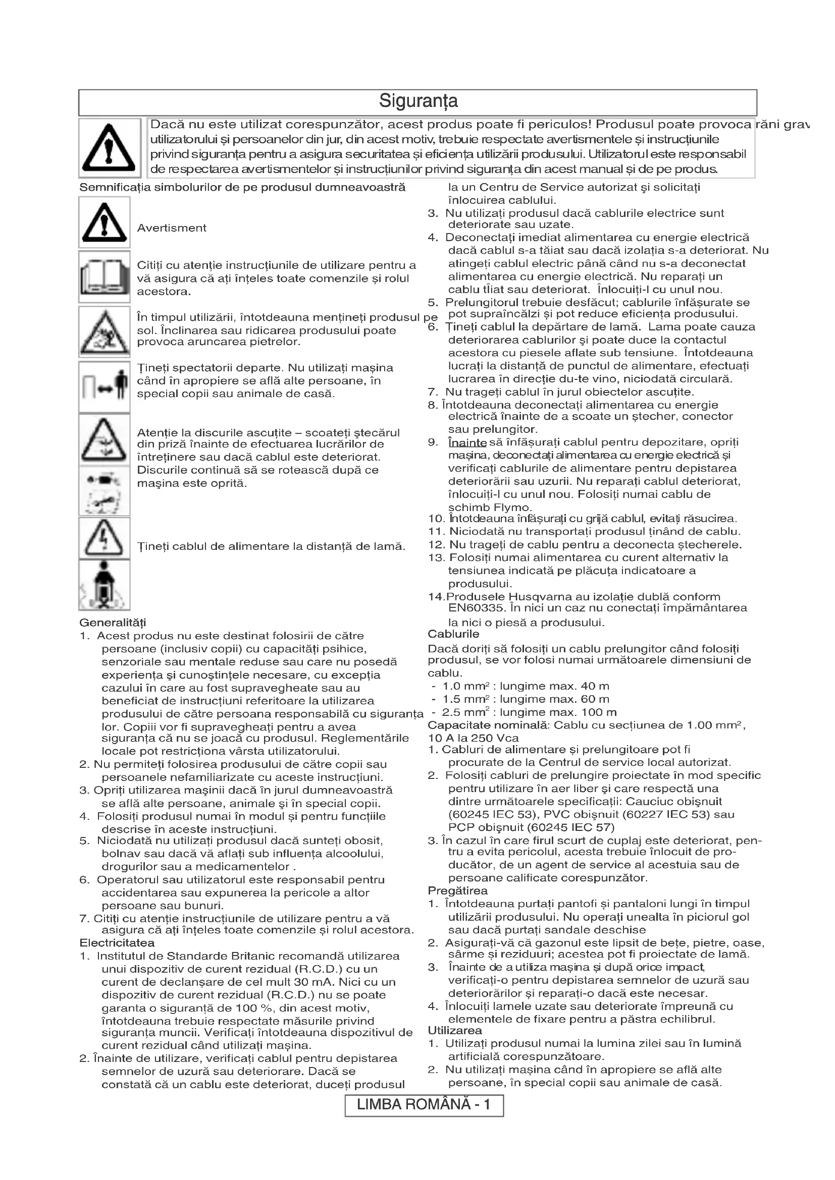 e respectarea avertismentelor și instrucţiunilor privind siguranţa din acest manual și de pe produs. Semnificaţia simbolurilor de pe produsul dumneavoastră Avertisment Citiţi cu atenţie instrucţiunile de utilizare pentru a vă asigura că aţi înţeles toate comenzile și rolul acestora. În timpul utilizării, întotdeauna menţineţi produsul pe sol. Înclinarea sau ridicarea produsului poate provoca aruncarea pietrelor. Ţineţi spectatorii departe. Nu utilizaţi mașina când în apropiere se află alte persoane, în special copii sau animale de casă. Atenţie la discurile ascuţite – scoateţi ştecărul din priză înainte de efectuarea lucrărilor de întreţinere sau dacă cablul este deteriorat. Discurile continuă să se rotească după ce maşina este oprită. Ţineţi cablul de alimentare la distanţă de lamă. Generalităţi