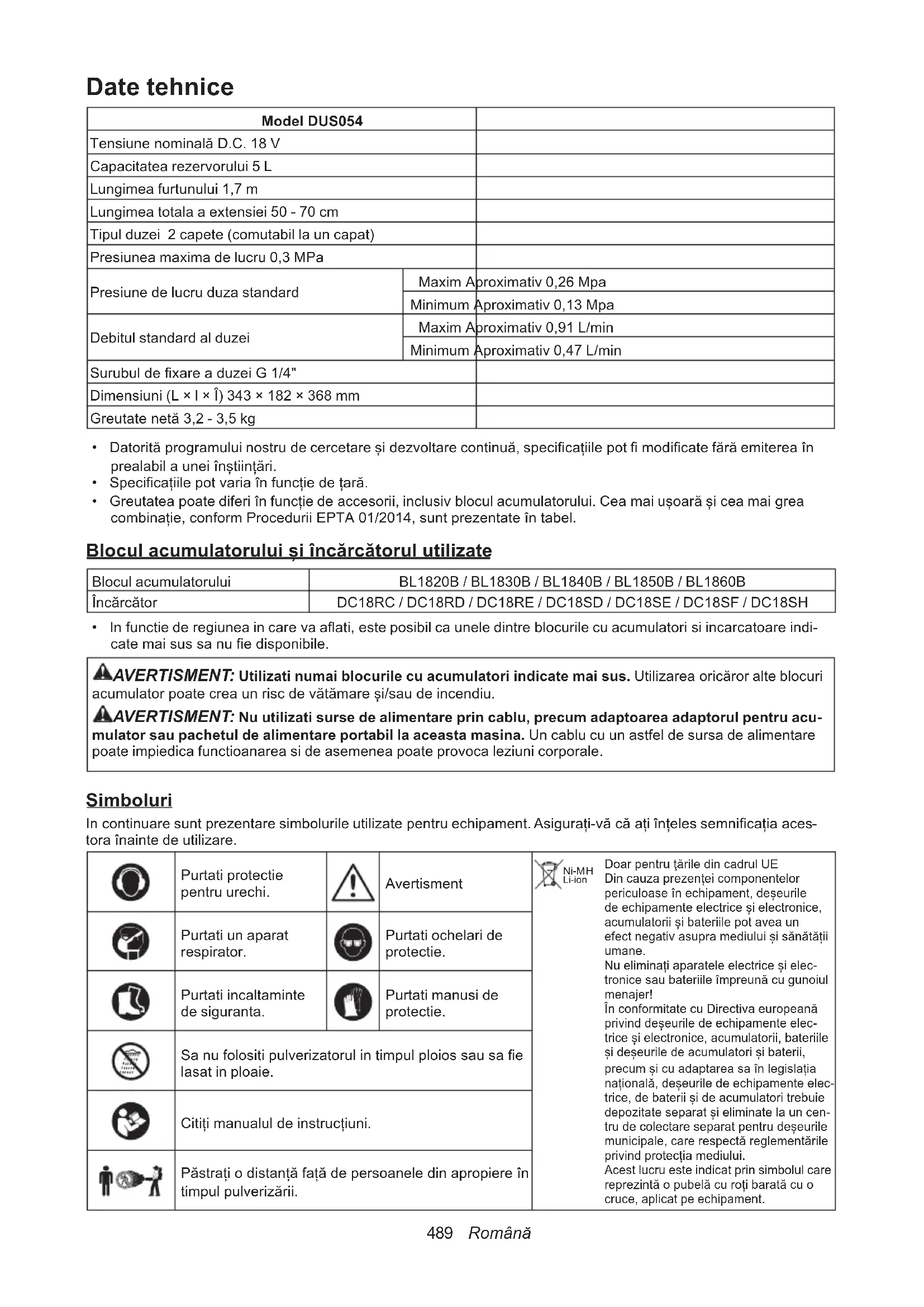 Li-ion Doar pentru ţările din cadrul UE Din cauza prezenței componentelor periculoase în echipament, deșeurile de echipamente electrice și electronice, acumulatorii și bateriile pot avea un efect negativ asupra mediului și sănătății umane. Nu eliminați aparatele electrice și elec- tronice sau bateriile împreună cu gunoiul menajer! În conformitate cu Directiva europeană privind deșeurile de echipamente elec- trice și electronice, acumulatorii, bateriile și deșeurile de acumulatori și baterii, precum și cu adaptarea sa în legislația națională, deșeurile de echipamente elec- trice, de baterii și de acumulatori trebuie depozitate separat și eliminate la un cen- tru de colectare separat pentru deșeurile municipale, care respectă reglementările privind protecția mediului. Acest lucru este indicat prin simbolul care reprezintă o pubelă cu roți barată cu o cruce, aplicat pe echipament. Purtati un aparat respirator. Purtati ochelari de protectie. Purtati incaltaminte de siguranta. Purtati manusi de protectie. Sa nu folositi pulverizatorul in timpul ploios sau sa e lasat in ploaie. Citiți manualul de instrucțiuni. Păstrați o distanță față de persoanele din apropiere în timpul pulverizării.490 Română