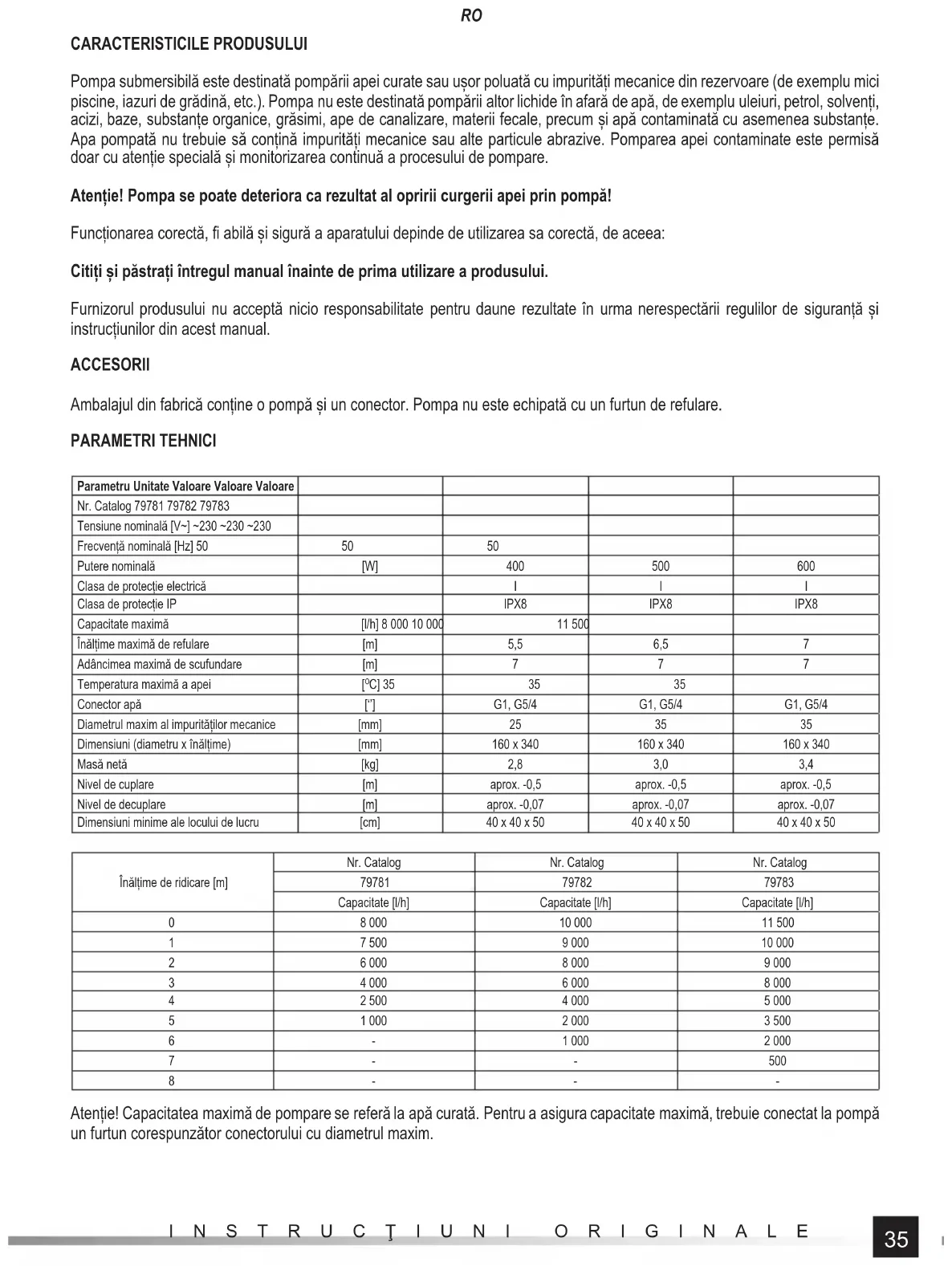 8--- Atenție! Capacitatea maximă de pompare se referă la apă curată. Pentru a asigura capacitate maximă, trebuie conectat la pompă un furtun corespunzător conectorului cu diametrul maxim.36