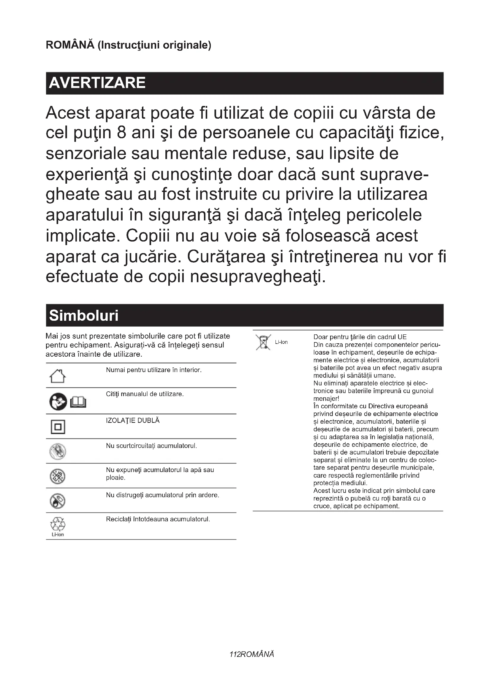 ► Слика6112 ROMÂNĂ ROMÂNĂ (Instrucţiuni originale) AVERTIZARE Acest aparat poate utilizat de copiii cu vârsta de cel puţin 8 ani şi de persoanele cu capacităţi zice, senzoriale sau mentale reduse, sau lipsite de experienţă şi cunoştinţe doar dacă sunt suprave- gheate sau au fost instruite cu privire la utilizarea aparatului în siguranţă şi dacă înţeleg pericolele implicate. Copiii nu au voie să folosească acest aparat ca jucărie. Curăţarea şi întreţinerea nu vor efectuate de copii nesupravegheaţi. Simboluri Mai jos sunt prezentate simbolurile care pot utilizate pentru echipament. Asigurați-vă că înțelegeți sensul acestora înainte de utilizare. Numai pentru utilizare în interior. Citiţi manualul de utilizare.
