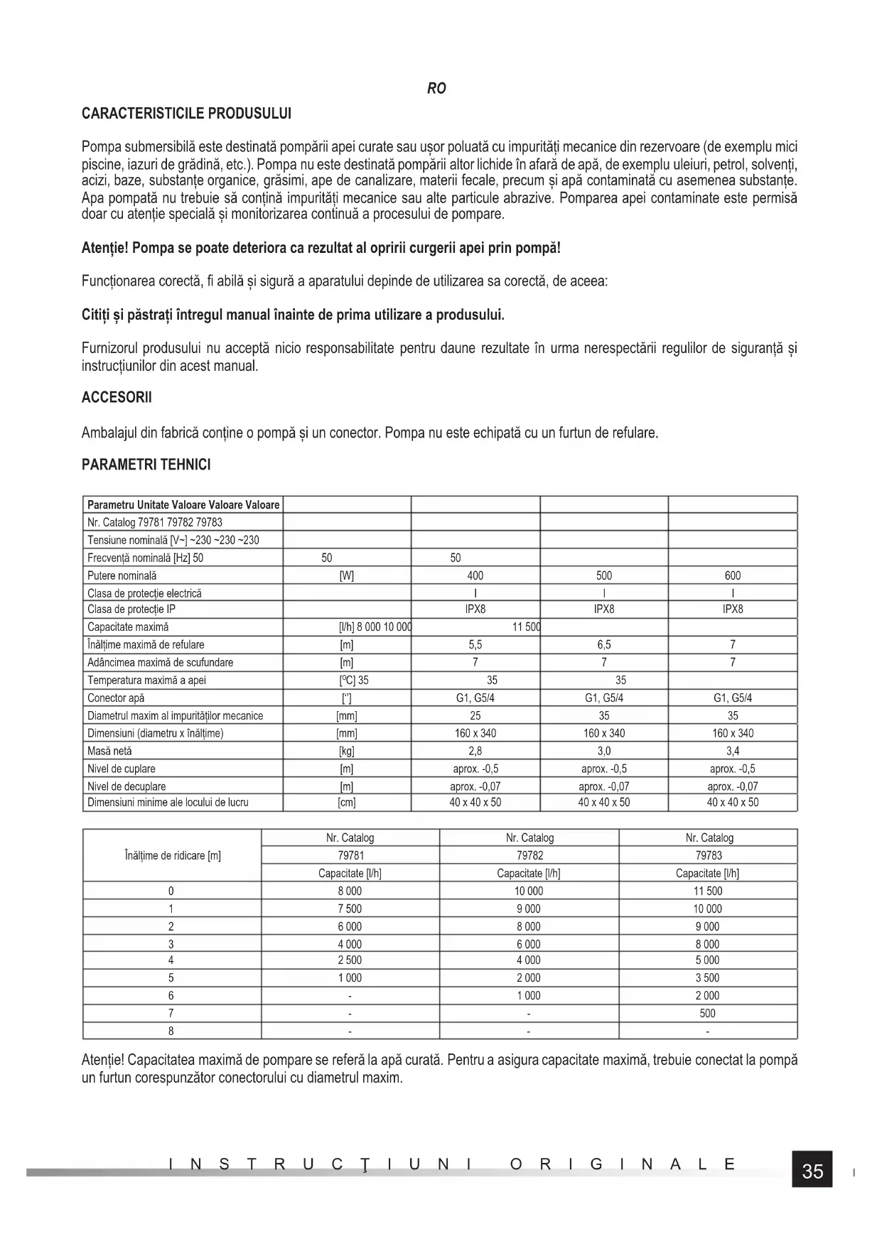 8--- Atenție! Capacitatea maximă de pompare se referă la apă curată. Pentru a asigura capacitate maximă, trebuie conectat la pompă un furtun corespunzător conectorului cu diametrul maxim.36