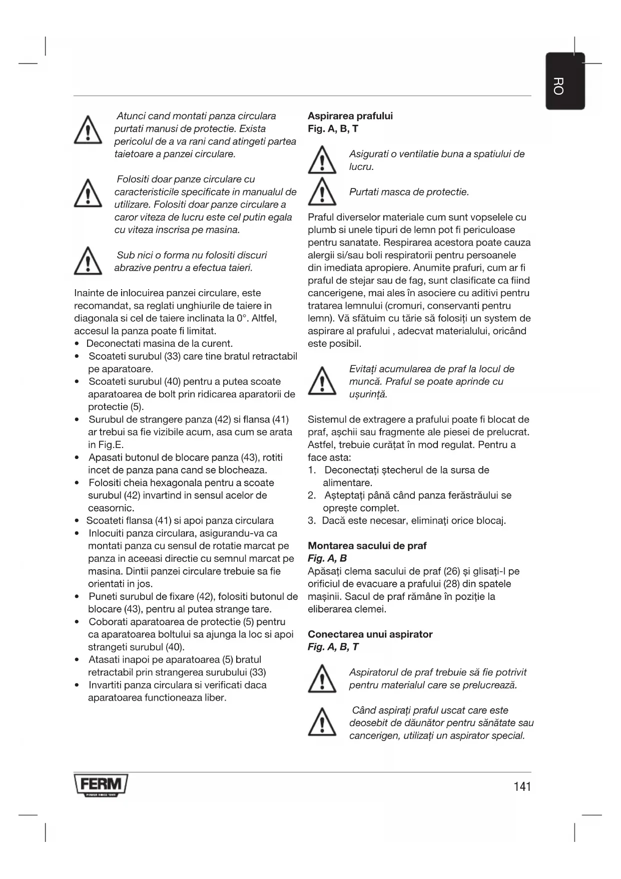 - Invartiti panza circulara si verificati daca aparatoarea functioneaza liber. Aspirarea prafului Fig. A, B, T Asigurati o ventilatie buna a spatiului de lucru. Purtati masca de protectie. Praful diverselor materiale cum sunt vopselele cu plumb si unele tipuri de lemn pot fi periculoase pentru sanatate. Respirarea acestora poate cauza alergii si/sau boli respiratorii pentru persoanele din imediata apropiere. Anumite prafuri, cum ar fi praful de stejar sau de fag, sunt clasificate ca fiind cancerigene, mai ales în asociere cu aditivi pentru tratarea lemnului (cromuri, conservanti pentru lemn). Vă sfătuim cu tărie să folosiți un system de aspirare al prafului , adecvat materialului, oricând este posibil. Evitați acumularea de praf la locul de muncă. Praful se poate aprinde cu ușurință. Sistemul de extragere a prafului poate fi blocat de praf, așchii sau fragmente ale piesei de prelucrat. Astfel, trebuie curățat în mod regulat. Pentru a face asta:
