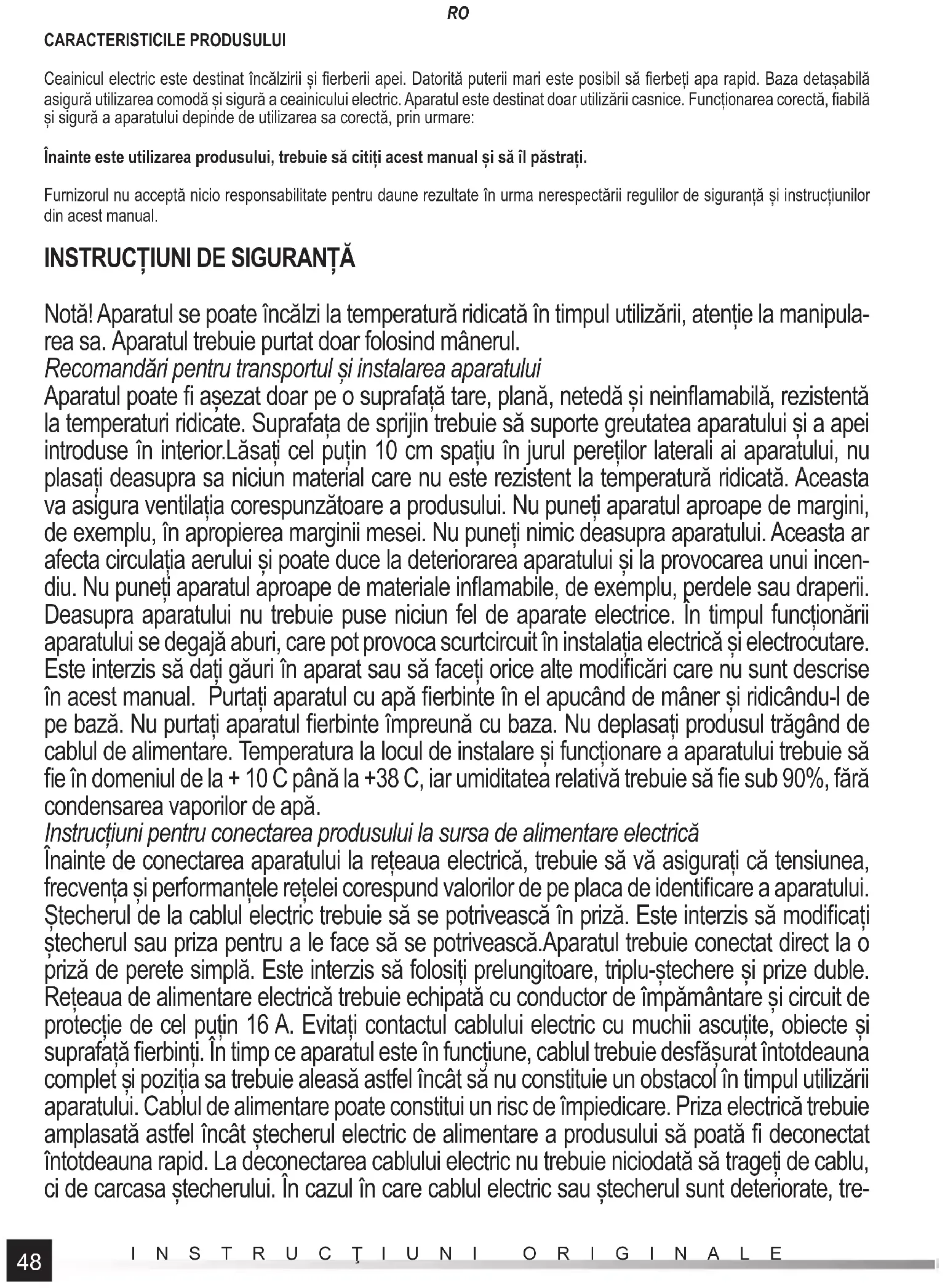 CARACTERISTICILE PRODUSULUI Ceainicul electric este destinat încălzirii și fi erberii apei. Datorită puterii mari este posibil să fi erbeți apa rapid. Baza detașabilă asigură utilizarea comodă și sigură a ceainicului electric. Aparatul este destinat doar utilizării casnice. Funcționarea corectă, fi abilă și sigură a aparatului depinde de utilizarea sa corectă, prin urmare: Înainte este utilizarea produsului, trebuie să citiți acest manual și să îl păstrați. Furnizorul nu acceptă nicio responsabilitate pentru daune rezultate în urma nerespectării regulilor de siguranță și instrucțiunilor din acest manual.