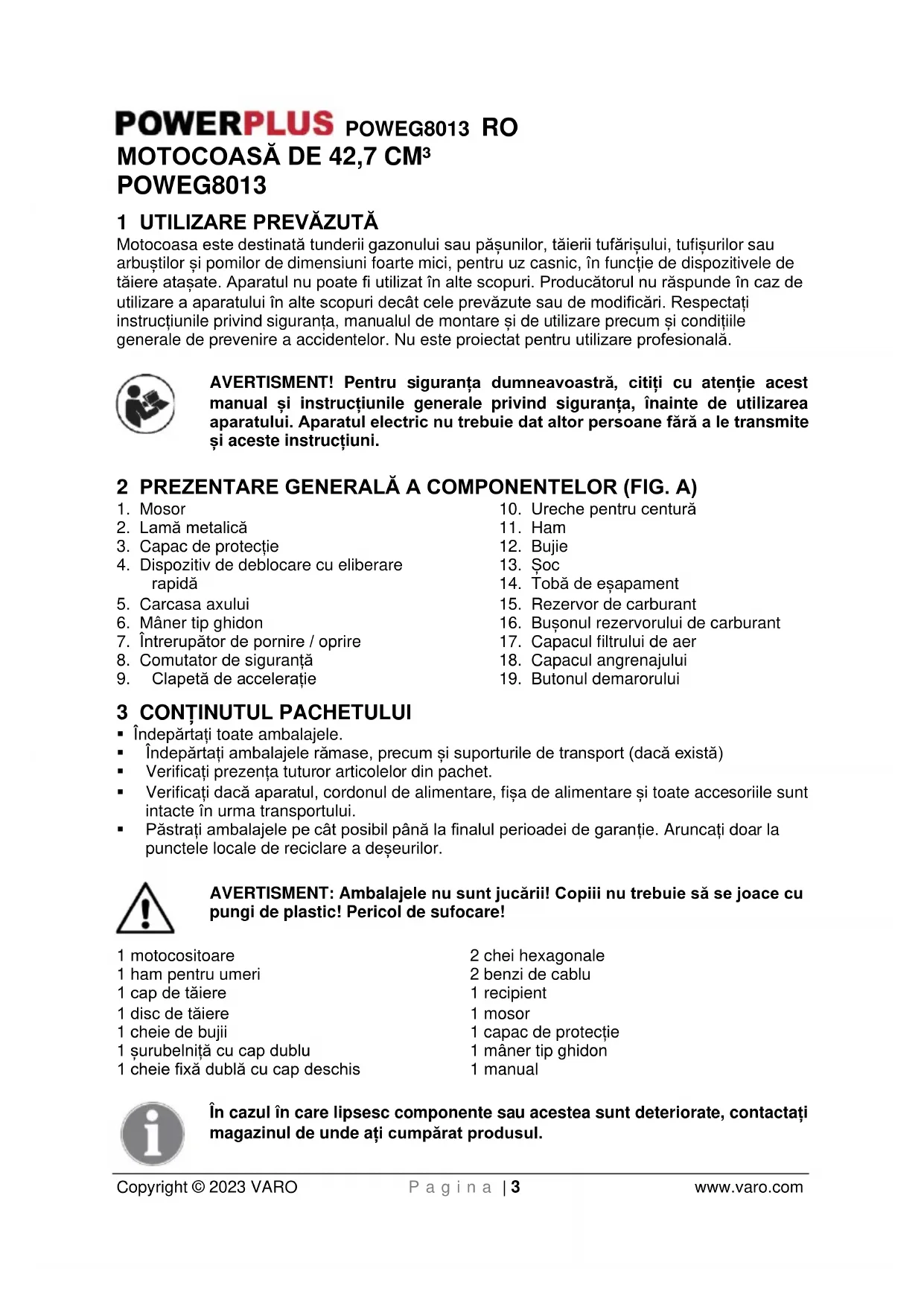 - Respectați toate recomandările privind întreținerea din capitolul „Întreținerea și îngrijirea”POWEG8013 RO Copyright © 2023 VARO P a g i n a | 13 www.varo.com
