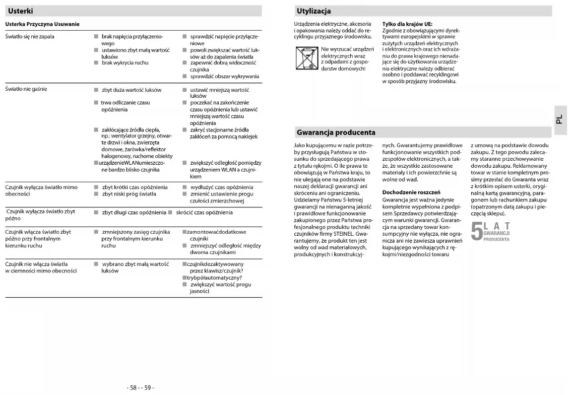 Valoarea luminozităţii de bază Prin apăsarea tastelor respective, > 5 s, valoarea luminozităţii de schimbă în pași de câte 10 % pe: 1 = 10 %, 2 = 20 %, ... 6 = 60 % Schimbarea luminozităţii de la butoane Dacă la borna S este conectat un buton, luminozitatea poate fi schimbată prin apăsarea butonu- lui. Butonul se setează mai întâi pe valoarea maximă și apoi revine la valoarea minimă. Dacă se eliberea- ză butonul, valoarea respectivă es- te menţinută, fără alte reglaje, pâ- nă la stingere. Ulterior detectorul se află în regi- mul cu senzor setat anterior. Direcţia schimbării luminozităţii (max./min.) se poate schimba prin- tr-o eliberare scurtă, urmată de o nouă apăsare a butonului.- 68 - - 69 - Garanţia de producător În calitate de cumpărător vă bucuraţi după caz de toate drep-turile prevăzute prin lege privind garanţia și reclamarea defectelor împotriva vânzătorului. În măsura în care aceste drepturi există în ţara dumneavoastră, declaraţia noastră de garanţie nici nu le restrânge și nici nu le reduce durata de valabilitate. Vă acor-dăm 5 ani de garanţie pentru funcţionarea ireproșabilă și cores-punzătoare a produsului dum-neavoastră cu senzor din gama STEINEL Professional. Garantăm că acest produs nu prezintă ni-ciun fel de erori de material, de producţie şi de proiectare. Garan-tăm funcţionalitatea tuturor com-ponentelor electronice şi a cablu-rilor, precum şi caracterul irepro-şabil al tuturor materialelor utili-zate şi al suprafeţelor acestora.Solicitarea garanţieiDacă aveţi o reclamaţie referitoa-re la produsul dvs., vă rugăm să îl trimiteţi întreg şi cu taxele de expediere plătite, împreună cu chitanţa originală care trebuie să conţină data cumpărării şi denu-mirea produsului, distribuitorului dvs. sau direct nouă, la adresa STEINEL Distribution SRL; 505400 Rasnov, jud.Brasov; Str. Campului, nr.1; FSR Hala Scularie Birourile 4-7. Din acest motiv vă recomandăm să păstraţi cu grijă chitanţa până la expirarea termenului de garanţie. STEINEL nu suportă costurile de transport şi nu îşi asumă riscurile asociate transportului pentru returnarea produselor.Informaţii privind solicitarea unei prestaţii în garanţie găsiţi pe pagina noastră web http://steinelshop.ro/ termeni-si-conditii#answer10 Dacă doriţi să solicitaţi o prestaţie în garanţie sau aveţi o întrebare despre produsul dvs., ne puteţi contacta la +40(0)268 - 530000. Defecţiuni de funcţionare Defecţiune Cauză RemediuNu se aprinde luminaL Nu există curentL Valoarea lucşilor este prea mică L Mişcările nu sunt detectateL Verificaţi alimentarea cu energie electricăL Creşteţi treptat valoarea luc-şilor până se aprinde luminaL Daţi la o parte obiectele care obstrucţionează vizibilitatea senzoruluiL Verificaţi aria de acoperireLumina nu se stingeL Valoarea lucşilor este prea mare L Durata de oprire temporizată tocmai se scurgeL Surse de căldură perturba-toare, precum: radiatoare cu ventilator, uşi şi ferestre deschise, animale de casă, radiatoare cu bec/halogen, obiecte aflate în mişcareL Dispozitivul WLAN poziţionat foarte aproape de senzorL Micşoraţi valoarea lucşilorL Aşteptaţi scurgerea duratei de oprire temporizată sau reduceţi eventual această perioadă de timpL Înlăturaţi problema surselor de perturbare staţionare folosind autocolanteL Măriţi distanţa dintre dispozi-tivul WLAN şi senzorÎn ciuda prezenţei persoanelor senzorul opreşte luminaL Durata de oprire temporizată este prea micăL Nivelul de lumină setat este prea scăzutL Creşteţi durata de oprire temporizatăL Reglaţi din nou luminozitateaSenzorul opreşte lumina prea târziuL Durata de oprire temporizată este prea lungăL Reduceţi durata de oprire temporizatăLa deplasarea frontală senzorul aprinde lumina prea târziuL Raza de acţiune este prea mi-că pentru deplasarea frontalăL Montaţi senzori suplimentariL Reduceţi distanţa dintre senzoriÎn ciuda întunericului, la apariţia unei persoane senzorul nu aprinde luminaL Valoarea setată a lucşilor este prea micăL Aţi dezactivat senzorul cu ajutorul comutatorului/ butonului?L Regim semiautomat de lucru?L Creşteţi nivelul de lumină (pragul)