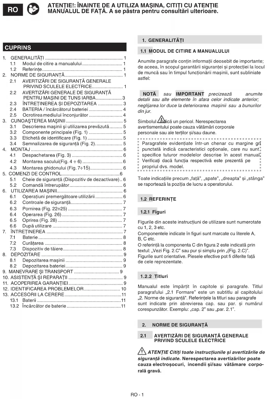 13.2 Încărcător de baterie ..........................................11RO - 2