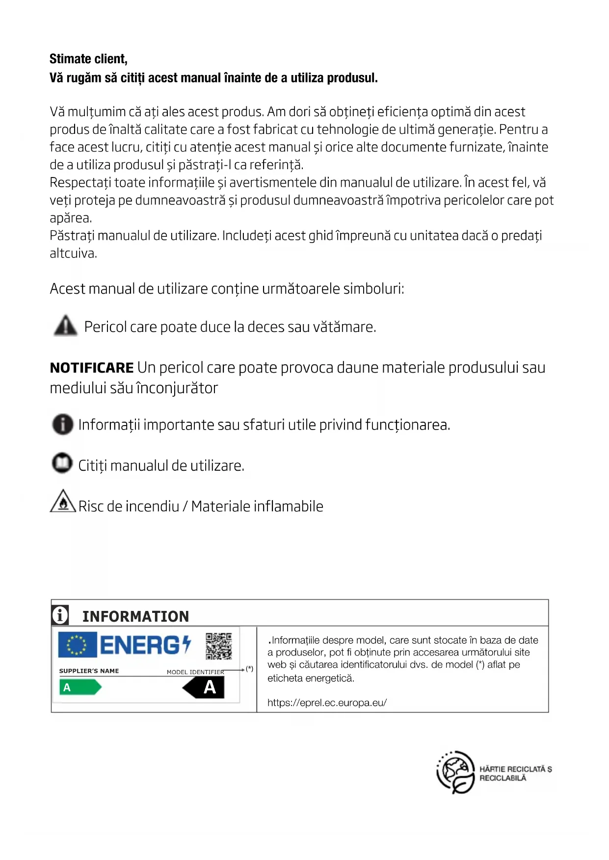 AVERTISMENT: Dacă problema persistă după ce aţi urmat instrucţiunile din acest capitol, contactaţi distribuitorul dvs. sau un centru de service autorizat. Nu încercaţi să reparaţi produsul.27 / 28 RO Frigider / Manual de utilizare MESAJ / AVERTISMENT Unele defecte (simple) pot fi tratate în mod adecvat de către utilizatorul final făr nicio probemă de siguranță sau utilizare nesigură, cu condiția să fie efectuate în limitele și în conformitate cu următoarele instrucțiuni (vezi secțiunea “Autoreparare”). Astfel, cu excepția cazului în care secțiunea “Autoreparare” de mai jos autorizează altă acțiune, reparațiile trebuie efectuarte de reparatori profesioniști pentru a evita probelemele de siguranță. Un reparator profesionist are acces la instrucțiuni și la lista cu piese de rezervă pentru acest produs de la producător, potrivit metodele descrise în actele legislative care urmează Directiva 2009/125/EC. Cu toate acestea, doar agentul de service (adică reparatorii profesioniști autorizați) pe care îl puteți contacta cu ajutorul numărului de telefon oferit în manualul de utilizare/ certificatul de garanție sau dealerul dvs. autorizat poate oferi service în termenii garanției. Prin urmare, nu uitați că reparațiile fectuate de reparatori profesioniști care nu sunt autorizați de Beko) vor antrena pierderea garanției. Autorepararea Reparațiile pot fi făcute de utilizatorul final doar în ceea ce privește următoarele piese: mânerele ușilor, balamale ușilor, tăvile, coșurile și garniturile ușilor(este disponibilă o listă actualizată pe support.beko.com începând cu data de 1 martie 2021). Mai mult, pentru siguranța produsului și pentru evitarea accidentărilor, autorepararea menționată va fi efectuată urmând instrucțiunile din manualul de utilizare sau care sunt disponibile în support. beko.com Pentru siguranța dvs., scoateți produsul din priză înainte să încercați autorepararea. Reparațiile și încercările de reparație făcute de utilizatorii finali pentru piese care nu usnt incluse într-o astfel de listă și/sau nu urmează instrucțiunile din manualele de utilzare pentru autoreparare sau care sunt disponibile în support.beko.com, pot duce la probleme de siguranță care nu sunt atribuibile Beko, și vor anula garanția produsului. Prin urmare, este recomandat ca utilizatorii finali să se abțină de la a încerca să efectueze reparații care ies din lista menționată cu piese de schimb, contactând în aceste cazuri reparatori profesioniști sau reparatori autorizați. Din contră, astfel de încercări efectuate de utilizatorii finali pot duce la probleme de siguranță și avarierea produsului sau iscarea unui incendiu, a unei indundații, a electrocutării și a accidentărilor grave. Spre exemplu, dar fără a se limita la, următoarele reparații trebuie adresate către service-uri profesionale autorizate sau înregistrate: compresoare, circuite de răcire, panoul principal, placa invertor, panoul de afișaj etc. Producătorul/vânzătorul nu răspund în niciun caz dacă utilizatorii finali nu se conformează cleor de mai sus.28 /28 RO Frigider / Manual de utilizare Disponibilitatea de piese de schimb pentru frigiderul pe care ați cumpărat-o este de 10 ani. În această perioadă, piesele de schimb originale vor fi disponibile pentru operarea adecvată a frigiderul. Durata minimă a garanției pentru frigiderul pe care l-ați achiziționat este de 24 de luni. Acest produs este echipat cu o sursă de iluminare din clasa energetică „G” Sursa de iluminare a acestui produs trebuie înlocuită numai de către reparatori profesioniști