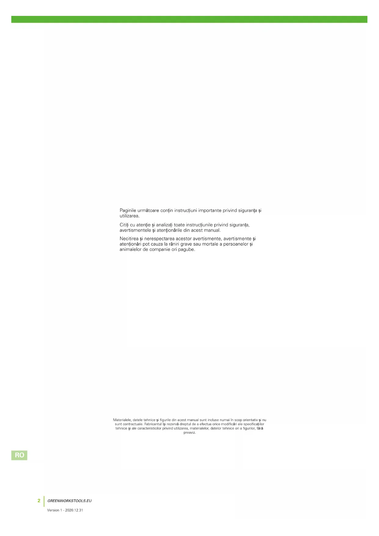 Version 1 - 2020.12.31 Materialele, datele tehnice și figurile din acest manual sunt incluse numai în scop orientativ și nu sunt contractuale. Fabricantul își rezervă dreptul de a efectua orice modificări ale specificațiilor tehnice și ale caracteristicilor privind utilizarea, materialelor, datelor tehnice ori a figurilor, fără preaviz. Paginile următoare conțin instrucțiuni importante privind siguranța și utilizarea. Citiți cu atenție și analizați toate instrucțiunile privind siguranța, avertismentele și atenționările din acest manual. Necitirea și nerespectarea acestor avertismente, avertismente și atenționări pot cauza la răniri grave sau mortale a persoanelor și animalelor de companie ori pagube.GREENWORKSTOOLS.EU