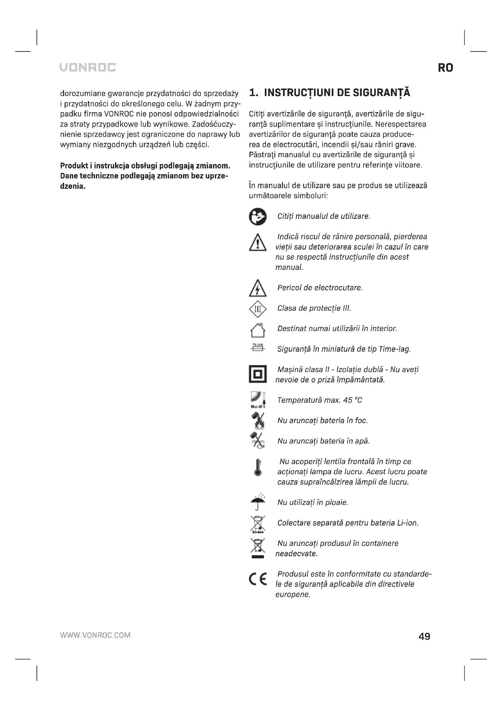 Curăţarea Curăţaţi regulat carcasa maşinii cu ocârpă moale, de preferat după fiecare utilizare. Îndepărtaţi murdă- ria persistentă cu ocârpă moale înmuiată în clăbuci de săpun. Nu folosiţi solvenţi precum benzină, alcool, amoniac etc. Astfel de substanţe chimice vor deteriora componentele din plastic ale lămpii de lucru. MEDIU Aparatele electrice sau electronice deteriorate şi/sau defecte trebuie colectate în punctele de reciclare corespunzătoare. Numai pentru ţările din CE Nu aruncaţi echipamentele acţionate electric împreună cu gunoiul menajer. Conform Indicaţiei europene 2012/19/UE pentru echipamente electrice şi electronice uzate şi aimplementării sale la nivel naţional, echipamentele acţionate electric scoase din uz trebuie colectate separat şi evacuate într-omani- eră ecologică. GARANŢIE Produsele VONROC sunt realizate la cele mai înalte standarde de calitate şi sunt garantate în privinţa materialelor şi amanoperei pentru întreaga perioa- dă de utilizare în garanţie, începând cu data achizi- ţiei. În cazul în care produsul prezintă defecţiuni în perioada de garanţie din cauza materialului defect şi/sau amanoperei, contactaţi direct VONROC. Următoarele circumstanţe sunt excluse de la această garanţie: