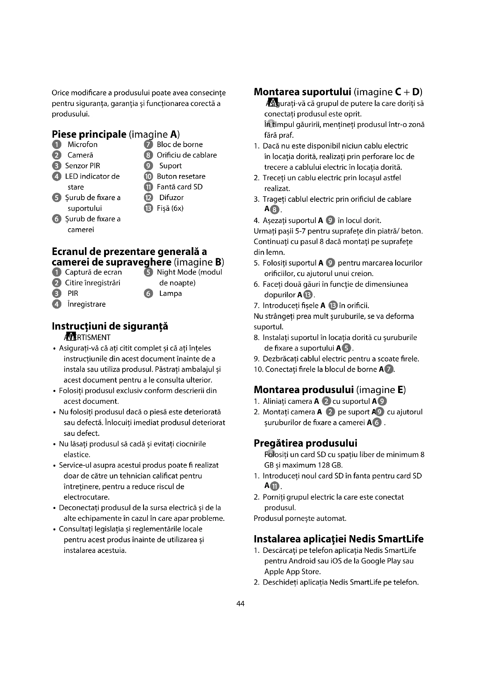 Orice modicare a produsului poate avea consecințe pentru siguranța, garanția și funcționarea corectă a produsului. Piese principale (imagine A) 1 Microfon 2 Cameră 3 Senzor PIR 4 LED indicator de stare 5 Șurub de xare a suportului 6 Șurub de xare a camerei 7 Bloc de borne 8 Oriciu de cablare 9 Suport q Buton resetare w Fantă card SD e Difuzor r Fișă (6x) Ecranul de prezentare generală a camerei de supraveghere (imagine B) 1 Captură de ecran 2 Citire înregistrări 3 PIR 4 Înregistrare 5 Night Mode (modul de noapte) 6 Lampa Instrucțiuni de siguranță