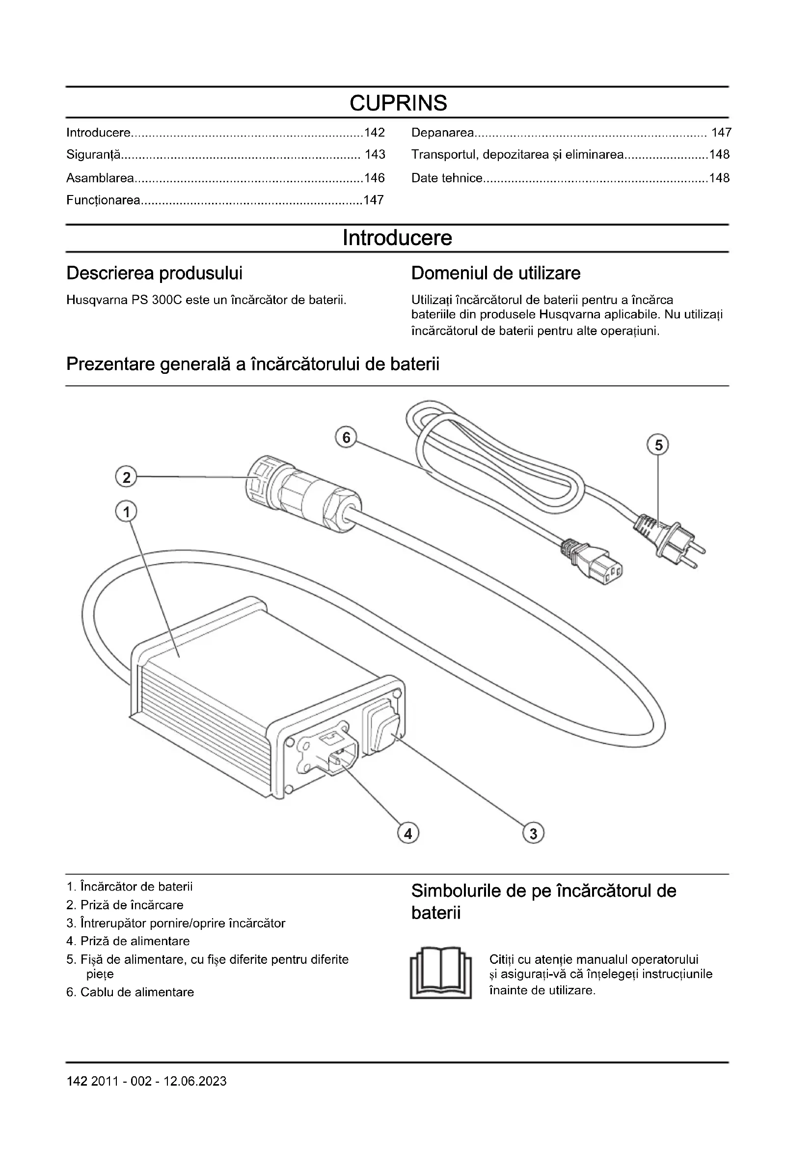 Simbolurile de pe încărcătorul de baterii Citiți cu atenție manualul operatorului și asigurați-vă că înțelegeți instrucțiunile înainte de utilizare. 142 2011 - 002 - 12.06.2023Încărcătorul de baterii este în conformitate cu directivele CE aplicabile. Acest încărcător de baterii este în conformitate cu reglementările aplicabile din Regatul Unit. IP54 - Încărcătorul de baterii are protecție împotriva prafului și a stropilor. Încărcătorul de baterii sau ambalajul încărcătorului de baterii nu sunt deșeuri menajere. Reciclați-l la o unitate de eliminare aprobată pentru echipamente electrice și electronice. Cod scanabil. Nota: Alte simboluri/autocolante de pe încărcătorul de baterii se referă la cerințele de certificare pentru unele zone comerciale. Siguranţă Definiții privind siguranța Avertismentele, atenționările și notele sunt utilizate pentru a desemna părți foarte importante din manual. AVERTISMENT: Se utilizează dacă există risc de vătămare sau de deces pentru operator sau pentru trecători, în cazul în care instrucțiunile din manual nu sunt respectate. ATENŢIE: Se utilizează dacă există un risc de deteriorare a produsului, a altor materiale sau a zonelor învecinate, dacă instrucțiunile din manual nu sunt respectate. Nota: Se utilizează pentru a furniza mai multe informații care sunt necesare într-o situație dată. Instrucțiuni de siguranță importante AVERTISMENT: Citiți toate avertismentele privind siguranța și toate instrucțiunile. Nerespectarea avertismentelor și instrucțiunilor poate avea ca rezultat electrocutare, incendii și/sau vătămări corporale grave. Nota: Păstrați toate avertismentele și instrucțiunile.