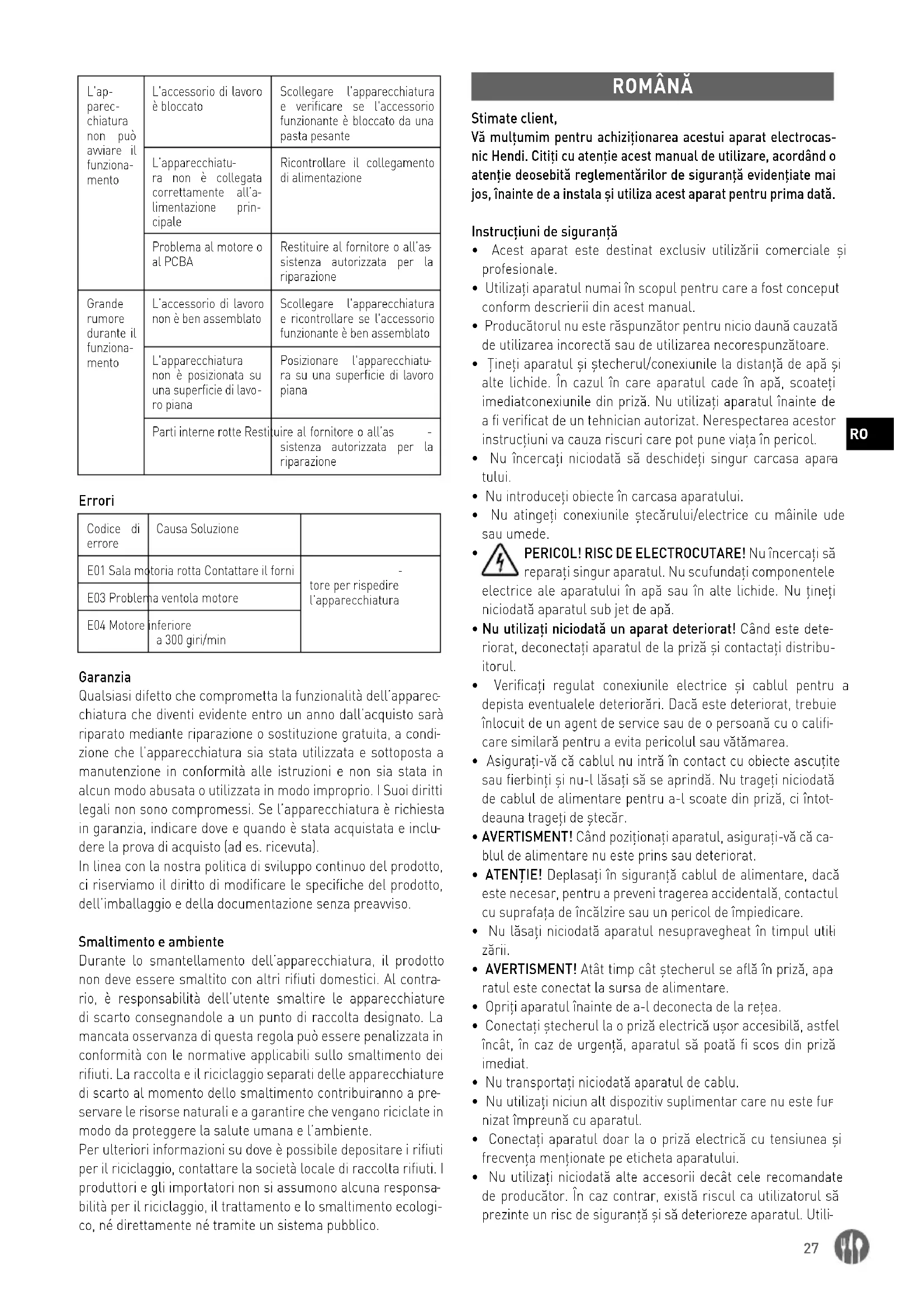 bilità per il riciclaggio, il trattamento e lo smaltimento ecologi- co, né direttamente né tramite un sistema pubblico. ROMÂNĂ Stimate client, Vă mulţumim pentru achiziţionarea acestui aparat electrocas- nic Hendi. Citiţi cu atenţie acest manual de utilizare, acordând o atenţie deosebită reglementărilor de siguranţă evidenţiate mai jos, înainte de a instala şi utiliza acest aparat pentru prima dată. Instrucţiuni de siguranţă