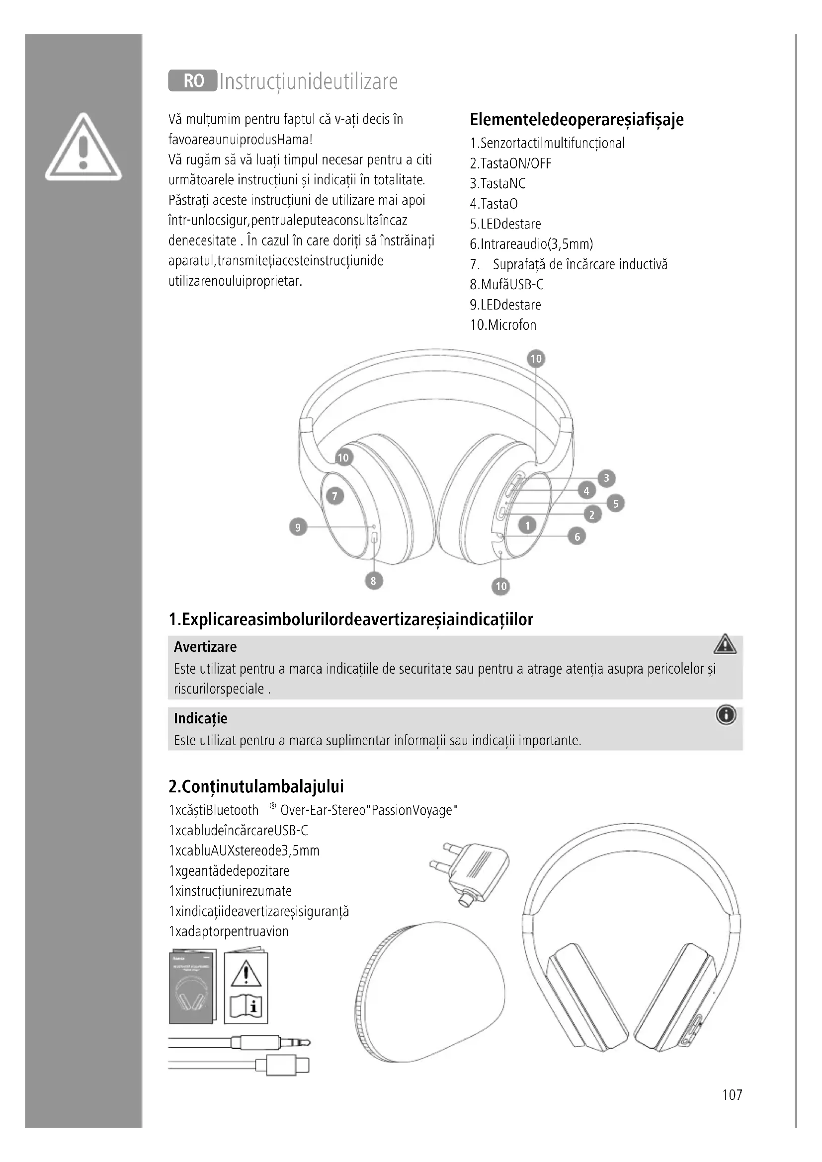 Over-Ear-Stereo "Passion Voyage" 1 x cablu de încărcare USB-C 1 x cablu AUX stereo de 3,5 mm 1 x geantă de depozitare 1 x instrucțiuni rezumate 1 x indicații de avertizare și siguranță 1 x adaptor pentru avion M Instrucțiuni de utilizare Vă mulțumim pentru faptul că v-ați decis în favoarea unui produs Hama! Vă rugăm să vă luați timpul necesar pentru a citi următoarele instrucțiuni și indicații în totalitate