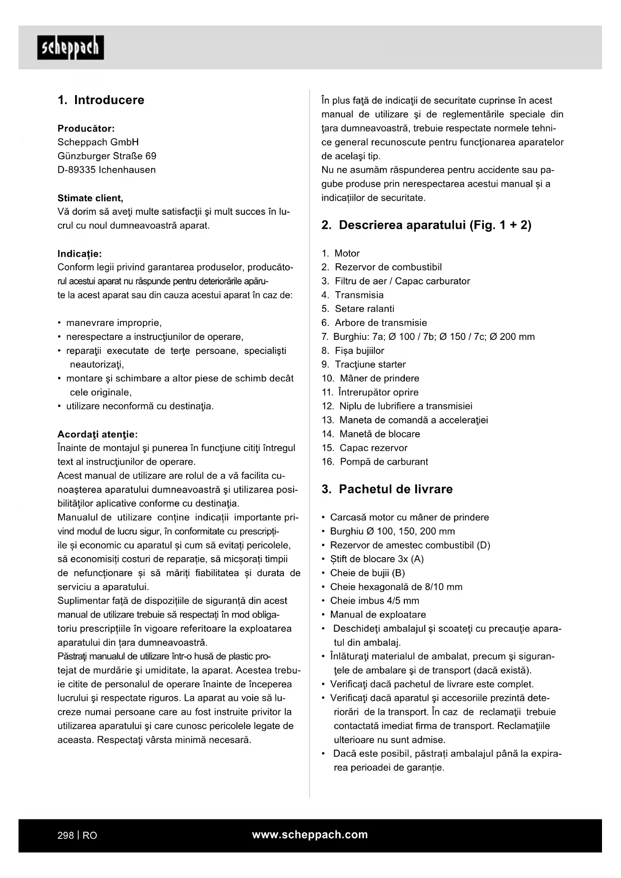 - utilizare neconformă cu destinaţia. Acordaţi atenţie: Înainte de montajul şi punerea în funcţiune citiţi întregul text al instrucţiunilor de operare. Acest manual de utilizare are rolul de a vă facilita cu- noaşterea aparatului dumneavoastră şi utilizarea posi- bilităţilor aplicative conforme cu destinaţia. Manualul de utilizare conține indicații importante pri- vind modul de lucru sigur, în conformitate cu prescripți- ile și economic cu aparatul și cum să evitați pericolele, să economisiți costuri de reparație, să micșorați timpii de nefuncționare și să măriți abilitatea și durata de serviciu a aparatului. Suplimentar față de dispozițiile de siguranță din acest manual de utilizare trebuie să respectați în mod obliga- toriu prescripțiile în vigoare referitoare la exploatarea aparatului din țara dumneavoastră. Păstraţi manualul de utilizare într-o husă de plastic pro- tejat de murdărie şi umiditate, la aparat. Acestea trebu- ie citite de personalul de operare înainte de începerea lucrului şi respectate riguros. La aparat au voie să lu- creze numai persoane care au fost instruite privitor la utilizarea aparatului şi care cunosc pericolele legate de aceasta. Respectaţi vârsta minimă necesară.www.scheppach.com