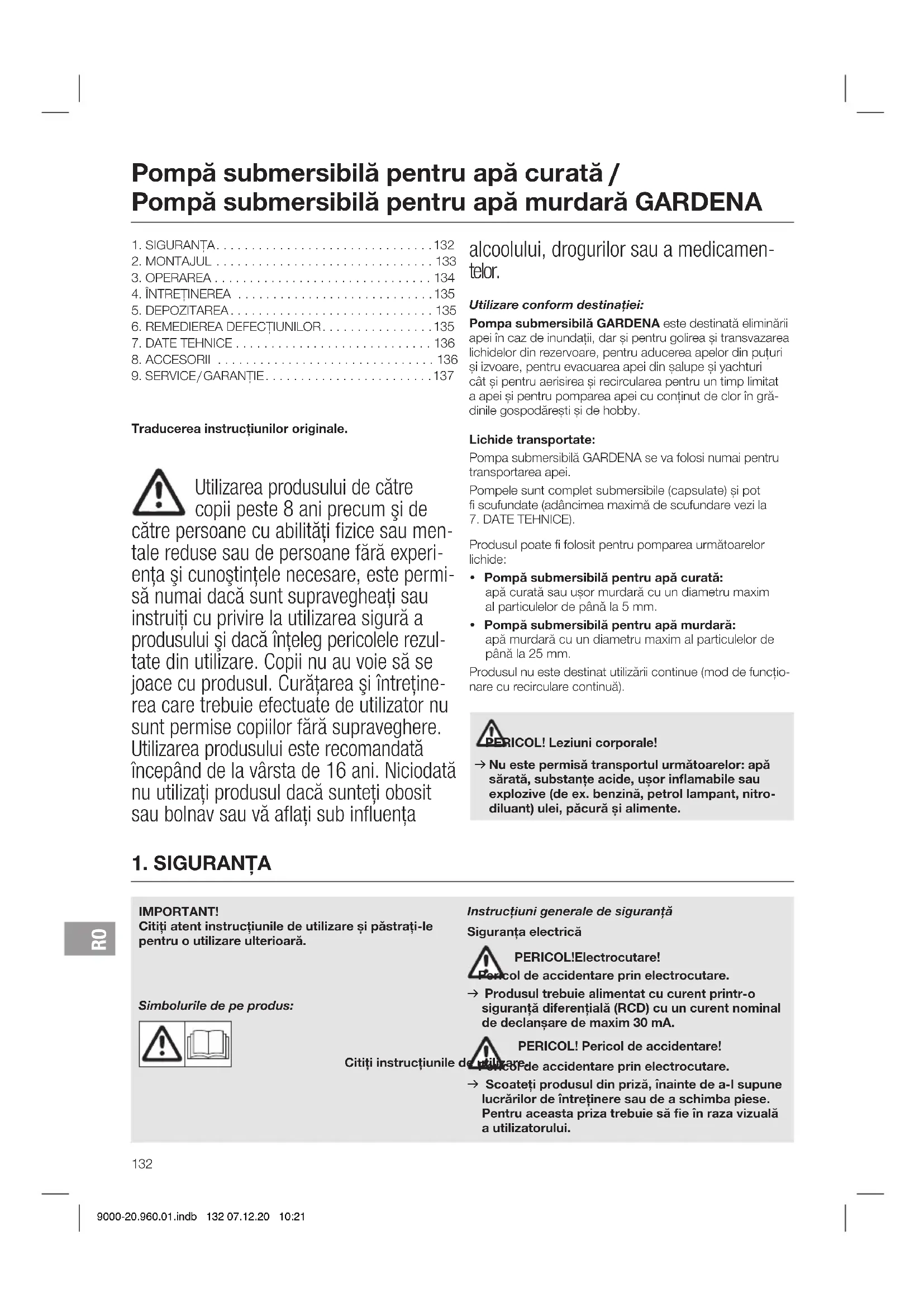 Traducerea instrucţiunilor originale. Utilizarea produsului de către copii peste 8 ani precum şi de către persoane cu abilităţi fizice sau men- tale reduse sau de persoane fără experi- enţa şi cunoştinţele necesare, este permi- să numai dacă sunt supravegheaţi sau instruiţi cu privire la utilizarea sigură a produsului şi dacă înţeleg pericolele rezul- tate din utilizare. Copii nu au voie să se joace cu produsul. Curăţarea şi întreţine- rea care trebuie efectuate de utilizator nu sunt permise copiilor fără supraveghere. Utilizarea produsului este recomandată începând de la vârsta de 16 ani. Niciodată nu utilizaţi produsul dacă sunteţi obosit sau bolnav sau vă aflaţi sub influenţa alcoolului, drogurilor sau a medicamen- telor. Utilizare conform destinaţiei: Pompa submersibilă GARDENA este destinată eliminării apei în caz de inundaţii, dar şi pentru golirea şi transvazarea lichidelor din rezervoare, pentru aducerea apelor din puţuri şi izvoare, pentru evacuarea apei din şalupe şi yachturi cât şi pentru aerisirea şi recircularea pentru un timp limitat a apei şi pentru pomparea apei cu conţinut de clor în gră- dinile gospodăreşti şi de hobby. Lichide transportate: Pompa submersibilă GARDENA se va folosi numai pentru transportarea apei. Pompele sunt complet submersibile (capsulate) şi pot fi scufundate (adâncimea maximă de scufundare vezi la