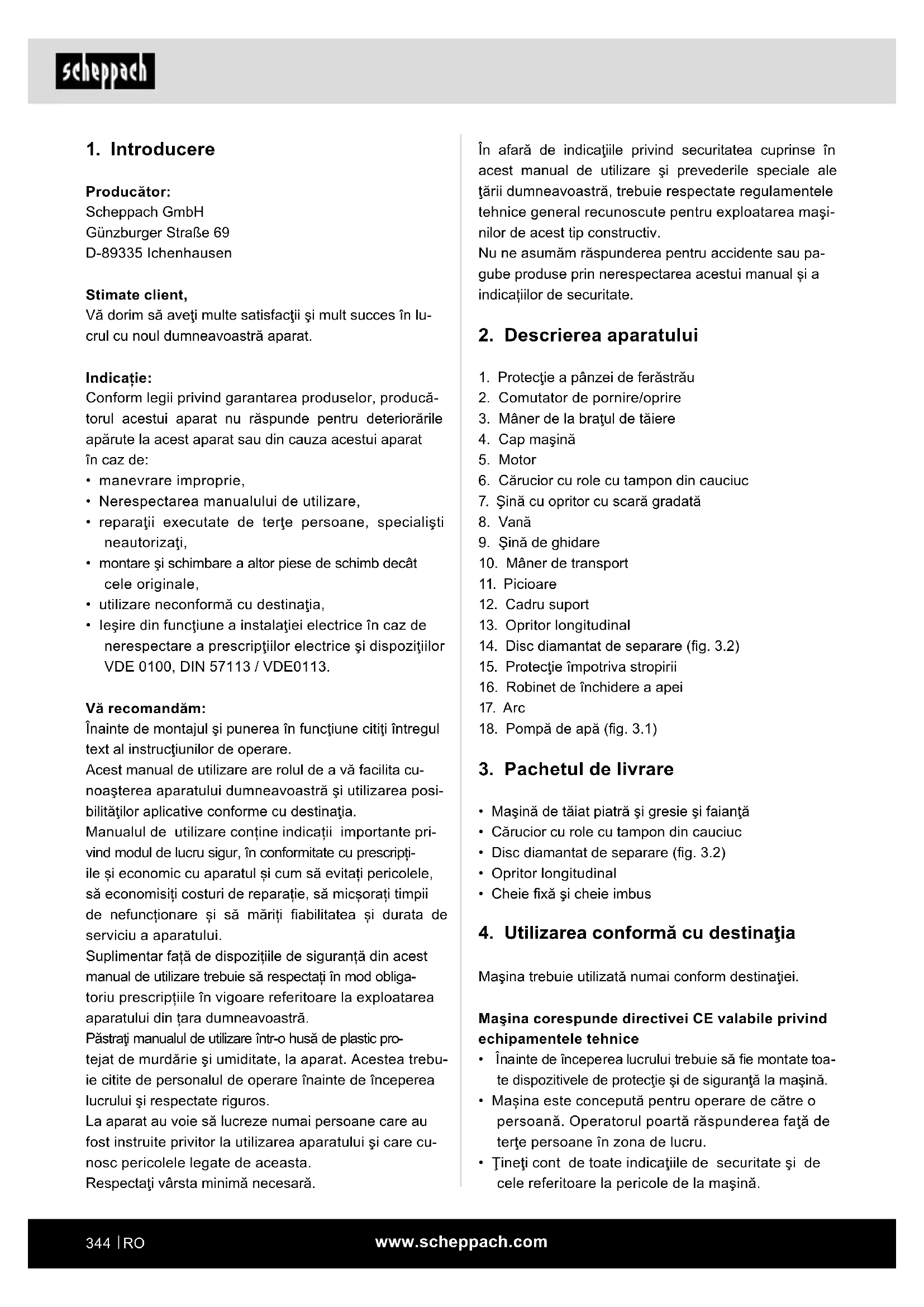 Producător: Scheppach GmbH Günzburger Straße 69 D-89335 Ichenhausen Stimate client, Vă dorim să aveţi multe satisfacţii şi mult succes în lu- crul cu noul dumneavoastră aparat. Indicație: Conform legii privind garantarea produselor, producă- torul acestui aparat nu răspunde pentru deteriorările apărute la acest aparat sau din cauza acestui aparat în caz de: