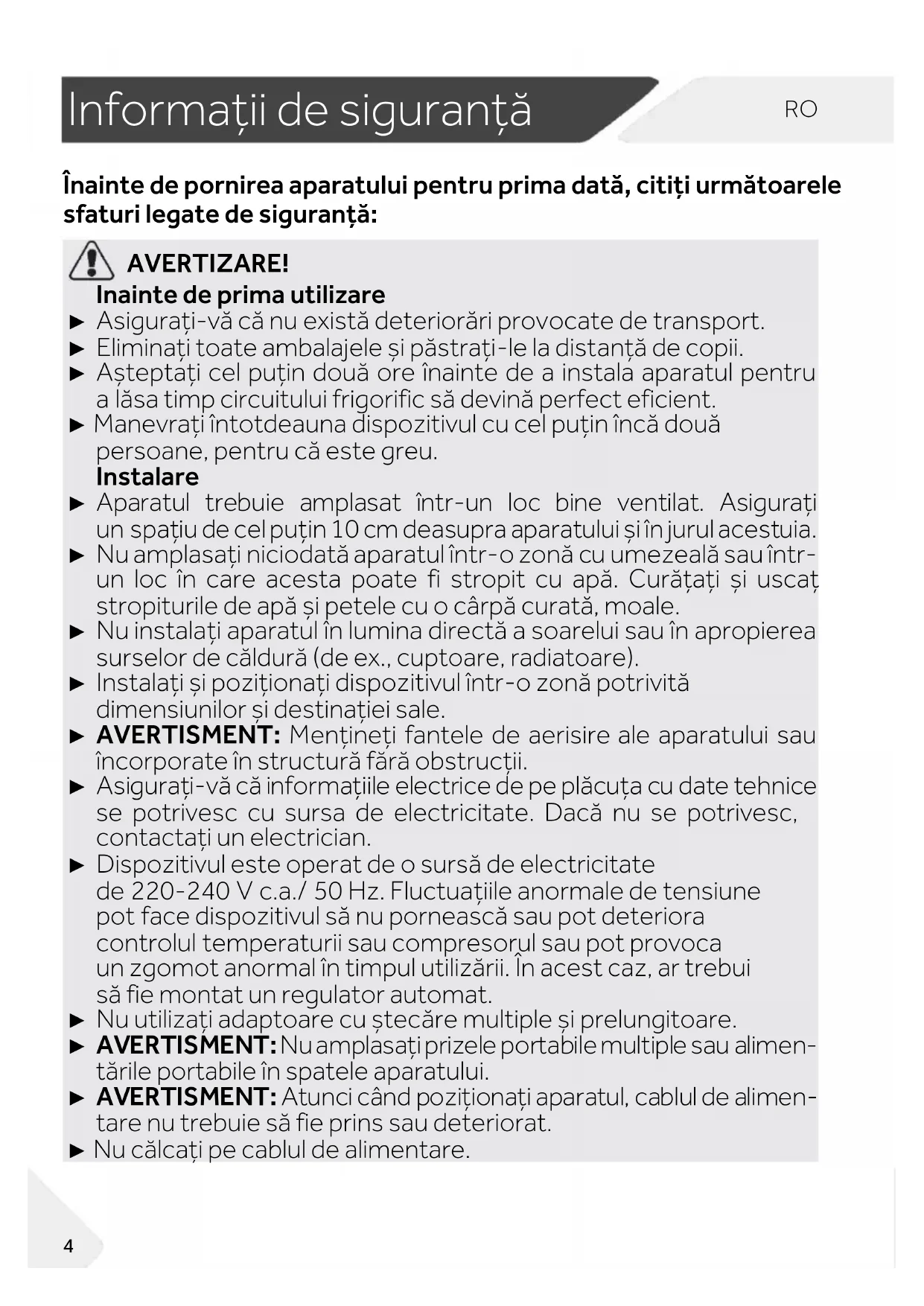 AVERTIZARE! Înainte de prima utilizare ► Asigurați-vă că nu există deteriorări provocate de transport. ► Eliminați toate ambalajele și păstrați-le la distanță de copii. ► Așteptați cel puțin două ore înainte de a instala aparatul pentru a lăsa timp circuitului frigorific să devină perfect eficient. ► Manevrați întotdeauna dispozitivul cu cel puțin încă două persoane, pentru că este greu. Instalare ► Aparatul trebuie amplasat într-un loc bine ventilat. Asigurați un spațiu de cel puțin 10 cm deasupra aparatului și în jurul acestuia. ► Nu amplasați niciodată aparatul într-o zonă cu umezeală sau într- un loc în care acesta poate fi stropit cu apă. Curățați și uscați stropiturile de apă și petele cu o cârpă curată, moale. ► Nu instalați aparatul în lumina directă a soarelui sau în apropierea surselor de căldură (de ex., cuptoare, radiatoare). ► Instalați și poziționați dispozitivul într-o zonă potrivită dimensiunilor și destinației sale. ► AVERTISMENT: Mențineți fantele de aerisire ale aparatului sau încorporate în structură fără obstrucții. ► Asigurați-vă că informațiile electrice de pe plăcuța cu date tehnice se potrivesc cu sursa de electricitate. Dacă nu se potrivesc, contactați un electrician. ► Dispozitivul este operat de o sursă de electricitate de 220-240 V c.a./ 50 Hz. Fluctuațiile anormale de tensiune pot face dispozitivul să nu pornească sau pot deteriora controlul temperaturii sau compresorul sau pot provoca un zgomot anormal în timpul utilizării. În acest caz, ar trebui să fie montat un regulator automat. ► Nu utilizați adaptoare cu ștecăre multiple și prelungitoare. ► AVERTISMENT: Nu amplasați prizele portabile multiple sau alimen- tările portabile în spatele aparatului. ► AVERTISMENT: Atunci când poziționați aparatul, cablul de alimen- tare nu trebuie să fie prins sau deteriorat. ► Nu călcați pe cablul de alimentare.RO Informații de siguranță