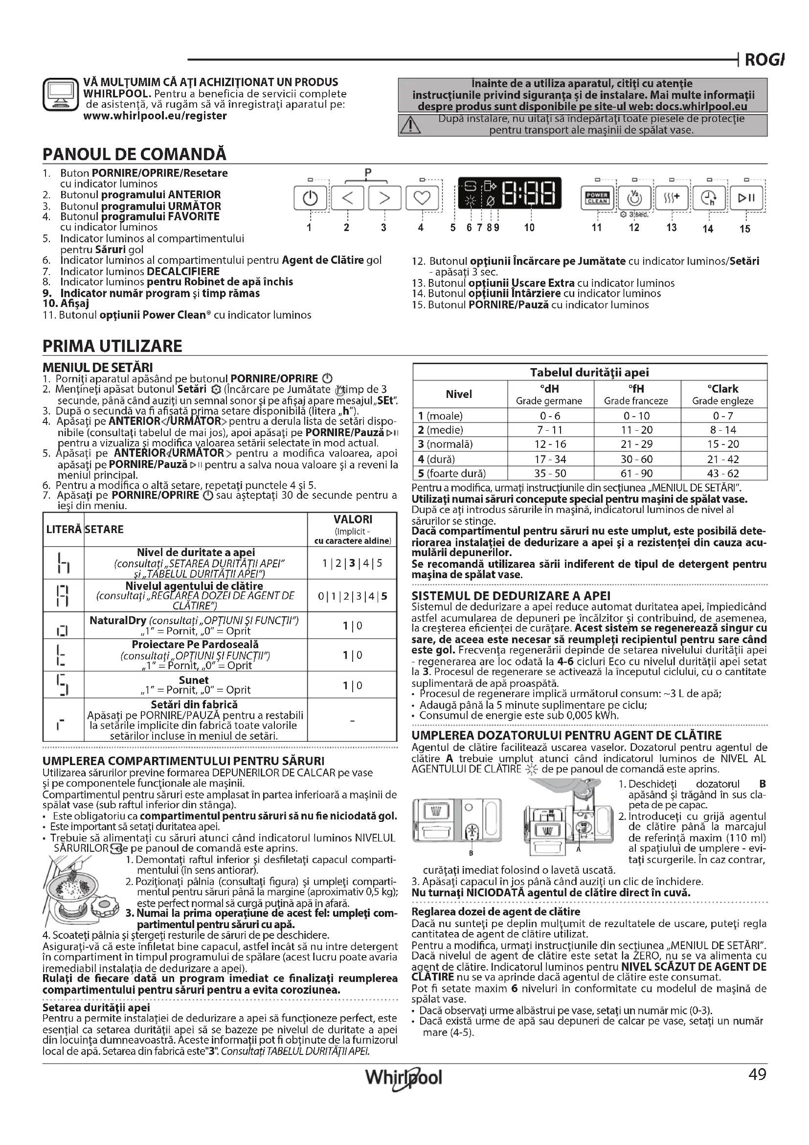 VĂ MULUMIM CĂ AI ACHIZIIONAT UN PRODUS WHIRLPOOL. Pentru a beneficia de servicii complete de asistenă, vă rugăm să vă înregistrai aparatul pe: www.whirlpool.eu/register Înainte de a utiliza aparatul, citii cu atenie instruciunile privind sigurana i de instalare. Mai multe informaii despre produs sunt disponibile pe site-ul web: docs.whirlpool.eu După instalare, nu uitai să îndepărtai toate piesele de protecie pentru transport ale mainii de spălat vase.
