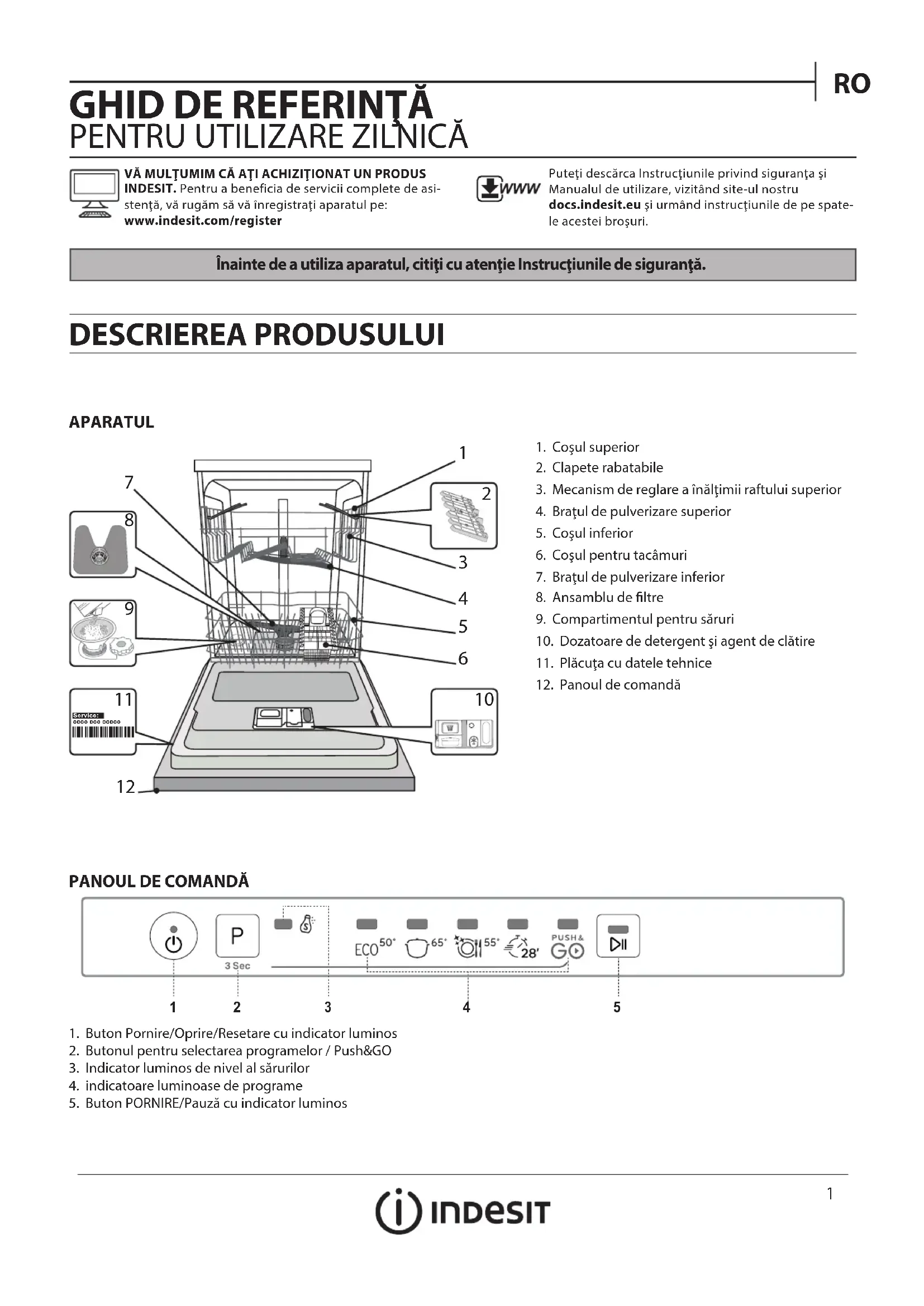 VĂ MULŢUMIM CĂ AŢI ACHIZIŢIONAT UN PRODUS INDESIT. Pentru a beneficia de servicii complete de asi-stenţă, vă rugăm să vă înregistraţi aparatul pe: www.indesit.com/register Puteţi descărca Instrucţiunile privind siguranţa şi Manualul de utilizare, vizitând site-ul nostru docs.indesit.eu şi urmând instrucţiunile de pe spate-le acestei broşuri.1. Buton Pornire/Oprire/Resetare cu indicator luminos2. Butonul pentru selectarea programelor / Push&GO3. Indicator luminos de nivel al sărurilor4. indicatoare luminoase de programe5. Buton PORNIRE/Pauză cu indicator luminos1. Coşul superior2. Clapete rabatabile3. Mecanism de reglare a înălţimii raftului superior4. Braţul de pulverizare superior5. Coşul inferior6. Coşul pentru tacâmuri7. Braţul de pulverizare inferior8. Ansamblu de ltre9. Compartimentul pentru săruri10. Dozatoare de detergent şi agent de clătire11. Plăcuţa cu datele tehnice12. Panoul de comandă0000 000 00000 Service: