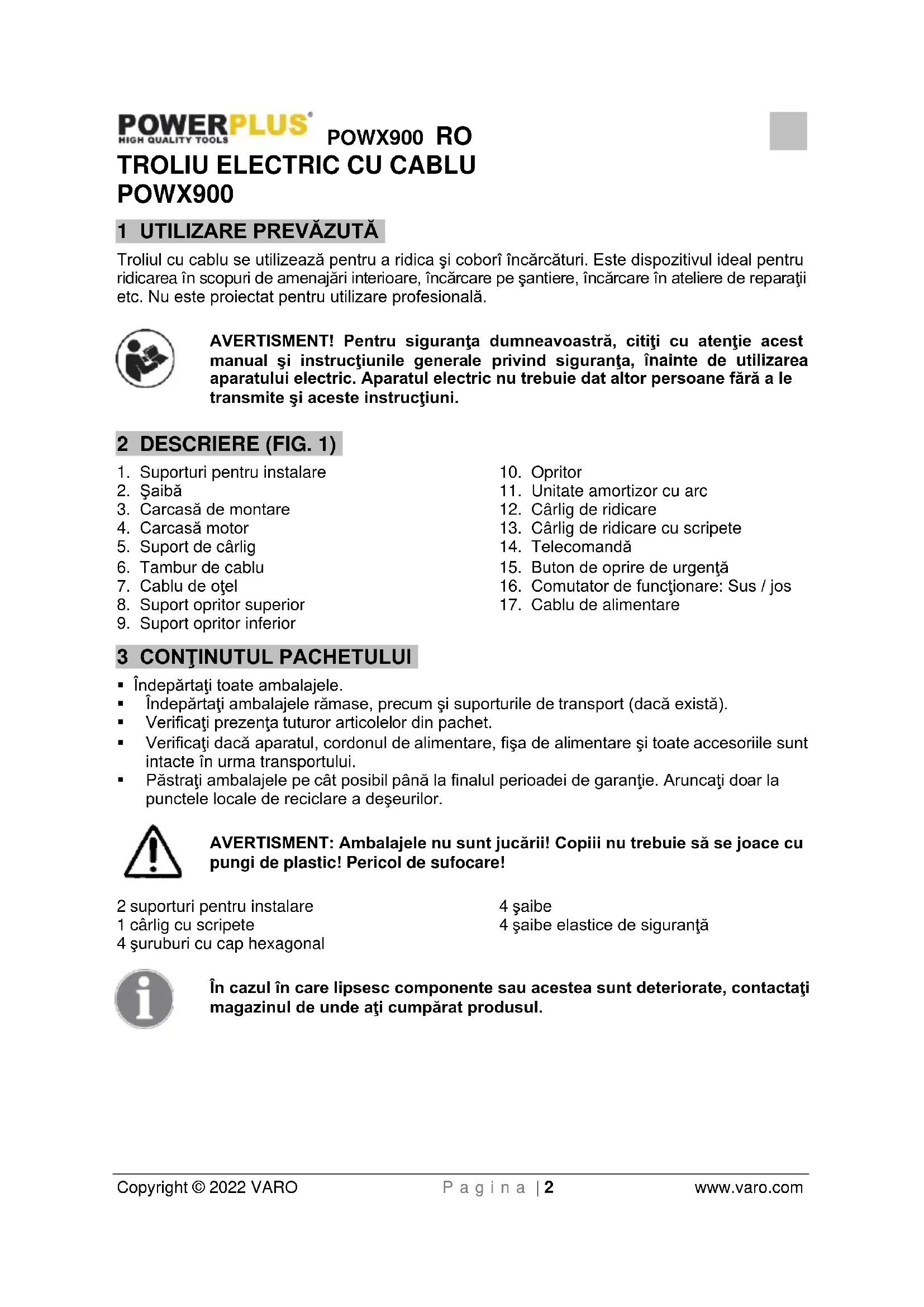 - Este interzisă înlocuirea oricărei componente a scripetelui sau demontarea acestuia.POWX900 RO Copyright © 2022 VARO P a g i n a | 6 www.varo.com