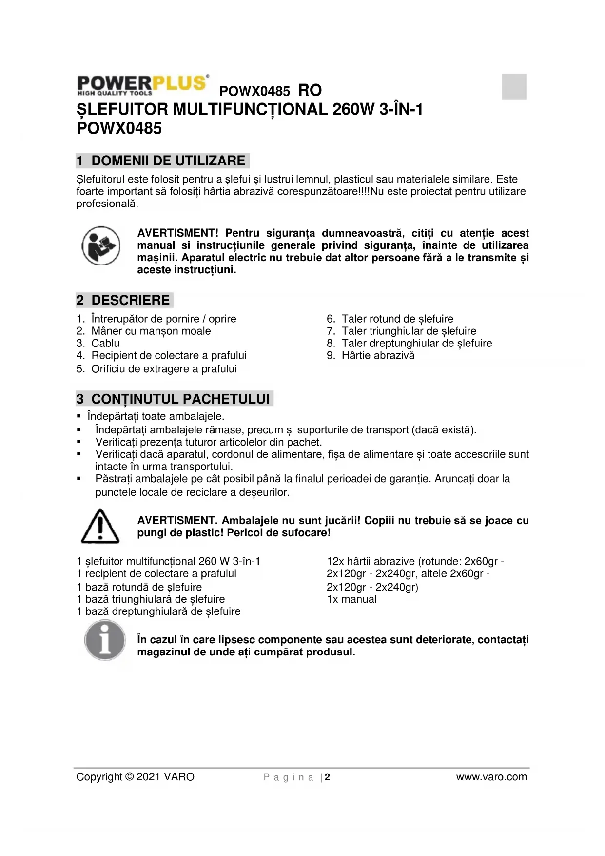 Îndepărtați toate ambalajele. Îndepărtați ambalajele rămase, precum și suporturile de transport (dacă există). Verificați prezența tuturor articolelor din pachet. Verificați dacă aparatul, cordonul de alimentare, fișa de alimentare și toate accesoriile sunt intacte în urma transportului. Păstrați ambalajele pe cât posibil până la finalul perioadei de garanție. Aruncați doar la punctele locale de reciclare a deșeurilor. AVERTISMENT. Ambalajele nu sunt jucării! Copiii nu trebuie să se joace cu pungi de plastic! Pericol de sufocare! 1 șlefuitor multifuncțional 260 W 3-în-1 1 recipient de colectare a prafului 1 bază rotundă de șlefuire 1 bază triunghiulară de șlefuire 1 bază dreptunghiulară de șlefuire 12x hârtii abrazive (rotunde: 2x60gr - 2x120gr - 2x240gr, altele 2x60gr - 2x120gr - 2x240gr) 1x manual În cazul în care lipsesc componente sau acestea sunt deteriorate, contactați magazinul de unde ați cumpărat produsul.POWX0485 RO Copyright © 2021 VARO P a g i n a | 3 www.varo.com 4 SIMBOLURI În acest manual și / sau pe mașină se folosesc următoarele simboluri: