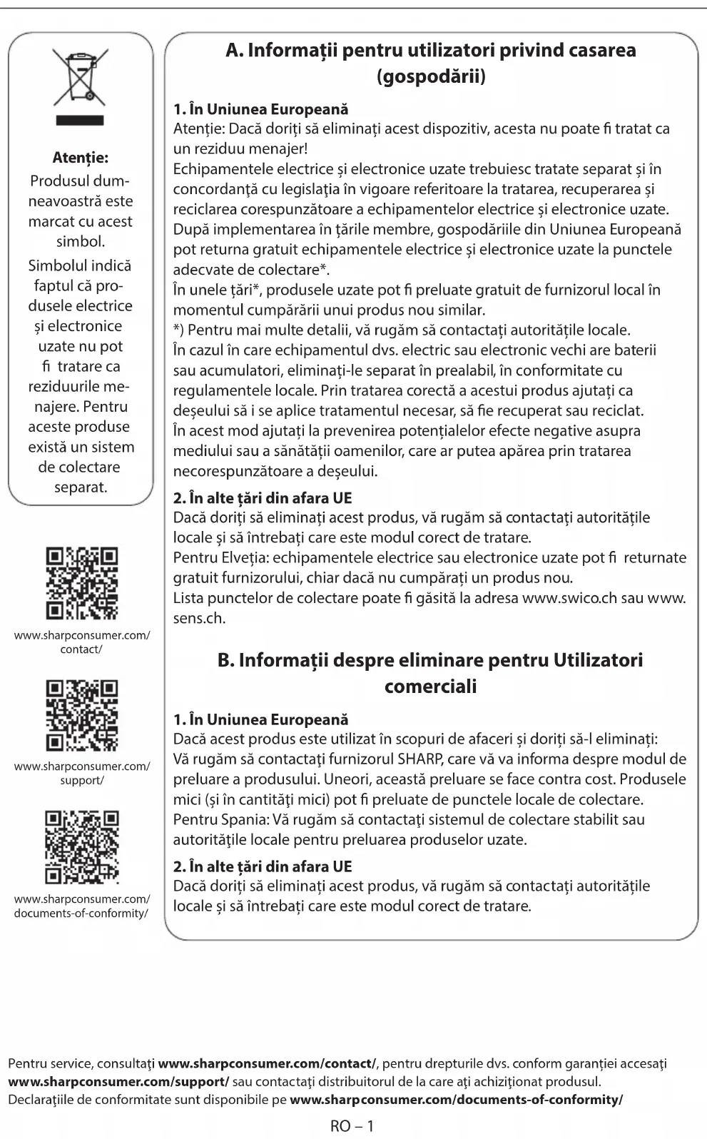 Dacă doriți să eliminați acest produs, vă rugăm să contactați autoritățile locale și să întrebați care este modul corect de tratare. Atenție: Produsul dum- neavoastră este marcat cu acest simbol. Simbolul indică faptul că pro- dusele electrice și electronice uzate nu pot tratare ca reziduurile me- najere. Pentru aceste produse există un sistem de colectare separat. www.sharpconsumer.com/ support/ www.sharpconsumer.com/ documents-of-conformity/ www.sharpconsumer.com/ contact/ Pentru service, consultaţi www.sharpconsumer.com/contact/, pentru drepturile dvs. conform garanției accesaţi www.sharpconsumer.com/support/ sau contactaţi distribuitorul de la care aţi achiziţionat produsul. Declaraţiile de conformitate sunt disponibile pe www.sharpconsumer.com/documents-of-conformity/RO RO – 1RO – 1 A. Informații pentru utilizatori privind casarea (gospodării)