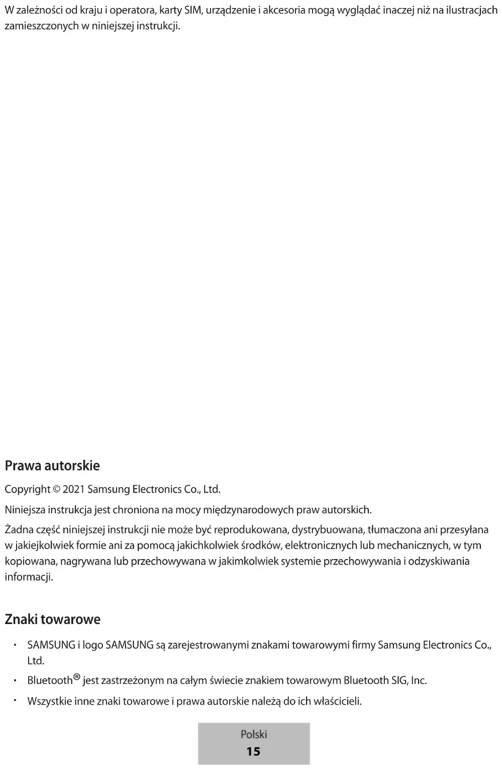 Samsung nu-și asumă răspunderea pentru daune sau pierderi (fie contractuale sau delictuale, inclusiv neglijenţă) care pot surveni din nerespectarea cu precizie a acestor avertizări și instrucţiuni, cu excepţia decesului sau vătămării personale ca urmare a neglijenței Samsung. Română 14Drepturi de autor Drepturi de autor © 2021 Samsung Electronics Co., Ltd. Acest manual este protejat în virtutea legislaţiei internaţionale privind drepturile de autor. Nicio parte a acestui manual nu poate fi reprodusă, distribuită, tradusă sau transmisă, sub nicio formă și prin niciun mijloc, electronic sau mecanic, inclusiv prin fotocopiere, înregistrare sau stocare în niciun sistem de stocare și recuperare a informațiilor. Mărci comerciale