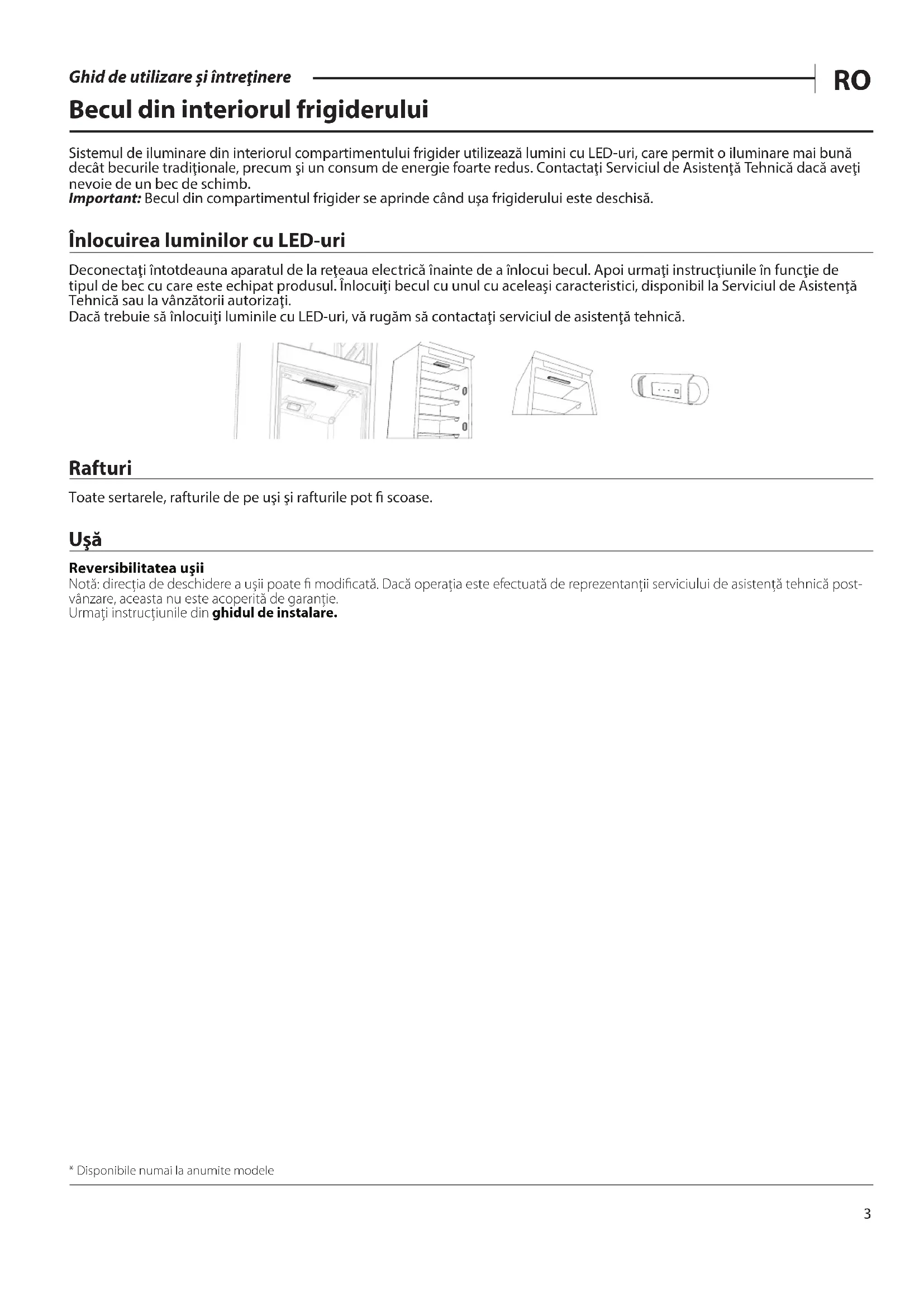 Ghid de utilizare şi întreţinere Becul din interiorul frigiderului Sistemul de iluminare din interiorul compartimentului frigider utilizează lumini cu LED-uri, care permit o iluminare mai bună decât becurile tradiţionale, precum şi un consum de energie foarte redus. Contactaţi Serviciul de Asistenţă Tehnică dacă aveţi nevoie de un bec de schimb. Important: Becul din compartimentul frigider se aprinde când uşa frigiderului este deschisă. Înlocuirea luminilor cu LED-uri Deconectaţi întotdeauna aparatul de la reţeaua electrică înainte de a înlocui becul. Apoi urmaţi instrucţiunile în funcţie de tipul de bec cu care este echipat produsul. Înlocuiţi becul cu unul cu aceleaşi caracteristici, disponibil la Serviciul de Asistenţă Tehnică sau la vânzătorii autorizaţi. Dacă trebuie să înlocuiţi luminile cu LED-uri, vă rugăm să contactaţi serviciul de asistenţă tehnică. Rafturi Toate sertarele, rafturile de pe uşi şi rafturile pot scoase. Uşă Reversibilitatea uşii Notă: direcţia de deschidere a uşii poate modicată. Dacă operaţia este efectuată de reprezentanţii serviciului de asistenţă tehnică post- vânzare, aceasta nu este acoperită de garanţie.Urmaţi instrucţiunile din ghidul de instalare.* Disponibile numai la anumite modele4 Ghid de utilizare şi întreţinere Cum se utilizează aparatul Prima utilizare După instalare, aşteptaţi cel puţin două ore înainte de a conecta aparatul la reţeaua electrică. Conectarea aparatului la reţeaua de alimentare cu energie electrică începe funcţionarea automată. Temperaturile ideale de depozitare a alimentelor sunt presetate din fabrică. După ce puneţi aparatul în funcţiune, trebuie să aşteptaţi 4-6 ore până când se atinge temperatura adecvată de păstrare a alimentelor pentru un aparat încărcat normal. Dacă aparatul este prevăzut cu ltru antibacterian şi anti-miros, amplasaţi-l în ventilator, aşa cum se indică pe ambalajul ltrului. Dacă este emis un semnal acustic, înseamnă că alarma de temperatură a fost activată: apăsaţi pe buton pentru a opri alarma sonoră. Compartimentul frigider şi depozitarea alimentelor Compartimentul frigider permite păstrarea alimentelor proaspete şi a băuturilor. Compartimentul frigider se dezgheaţă complet automat. Prezenţa ocazională a picăturilor de apă pe peretele interior posterior al compartimentului indică faza de dezgheţare automată. Apa rezultată din dezgheţare este condusă într-un canal de scurgere, apoi este colectată într-un recipient, din care se evaporă. Notă: temperatura ambiantă, frecvenţa cu care se deschid uşile şi poziţia aparatului pot inuenţa temperaturile interne în cele două compartimente. Setaţi temperaturile în conformitate cu aceşti factori. Într-un mediu cu umiditate foarte ridicată, în compartimentul frigider se poate produce condens, mai ales pe rafturile de sticlă. În acest caz, se recomandă să acoperiţi recipientele care conţin lichide (de ex. o oală cu supă), să ambalaţi alimentele cu conţinut ridicat de apă (de ex. legumele) şi să porniţi ventilatorul (dacă există). Toate sertarele, rafturile de pe uşi şi rafturile pot scoase. Funcţia Multiow de distribuţie a aerului Funcţia Multiow permite distribuţia uniformă a aerului rece în cavitate pentru conservarea optimă a alimentelor. Alimentele pot amplasate pe orice raft al aparatului. Aveţi grijă să nu blocaţi oriciile de ventilaţie pentru distribuţia aerului, asigurând astfel circulaţia liberă a acestuia. Depozitarea alimentelor proaspete şi băuturilor Alimentele care produc o cantitate mare de gaz etilenic (mere, caise, pere, piersici, avocado, smochine, prune, ane, pepeni, fasole) şi cele care sunt sensibile la acest gaz, precum fructele, legumele şi salata, trebuie să e separate întotdeauna sau ambalate pentru a nu se reduce durata lor de depozitare; de exemplu, nu depozitaţi roşii împreună cu kiwi sau varză. Nu apropiaţi alimentele prea mult unele de celelalte, pentru a permite circularea corespunzătoare a aerului. Folosiţi recipiente din plastic reciclabil, metal, aluminiu sau sticlă şi folie transparentă pentru a ambala alimentele. Dacă aveţi o cantitate mică de alimente de păstrat în frigider, vă recomandăm să folosiţi rafturile de deasupra sertarului pentru fructe şi legume, având în vedere că aceasta este zona cea mai rece din compartiment. Pentru lichidele şi alimentele care degajează miros sau pot prinde miros sau gust, folosiţi doar recipiente cu capac sau acoperiţi-le. Pentru a evita răsturnarea sticlelor, folosiţi suportul pentru sticle (disponibil doar la anumite modele).